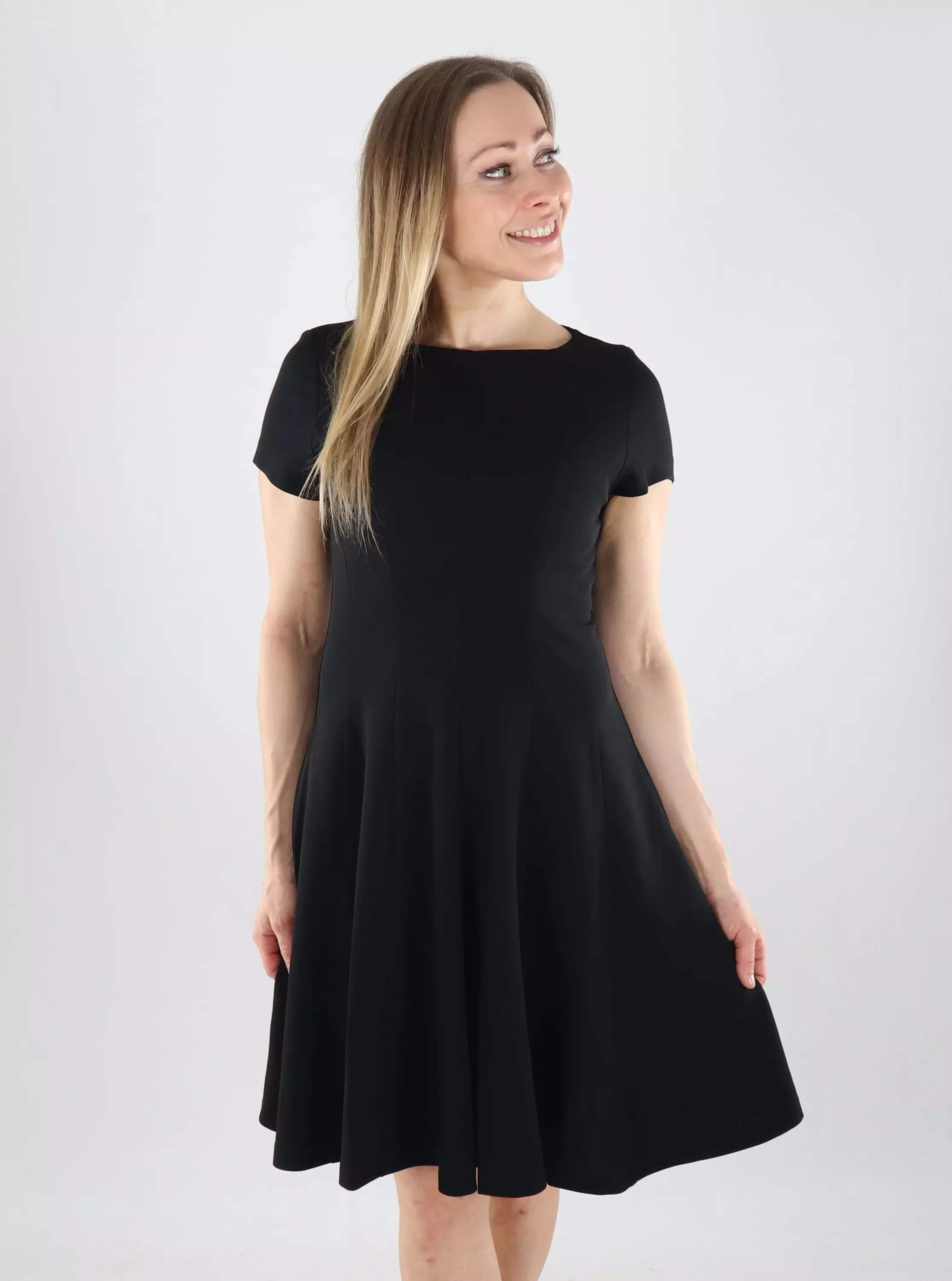 A-line, stretchy dress that fits beautifully and feels comfortable on you. Easy to style for both office wear and parties!
