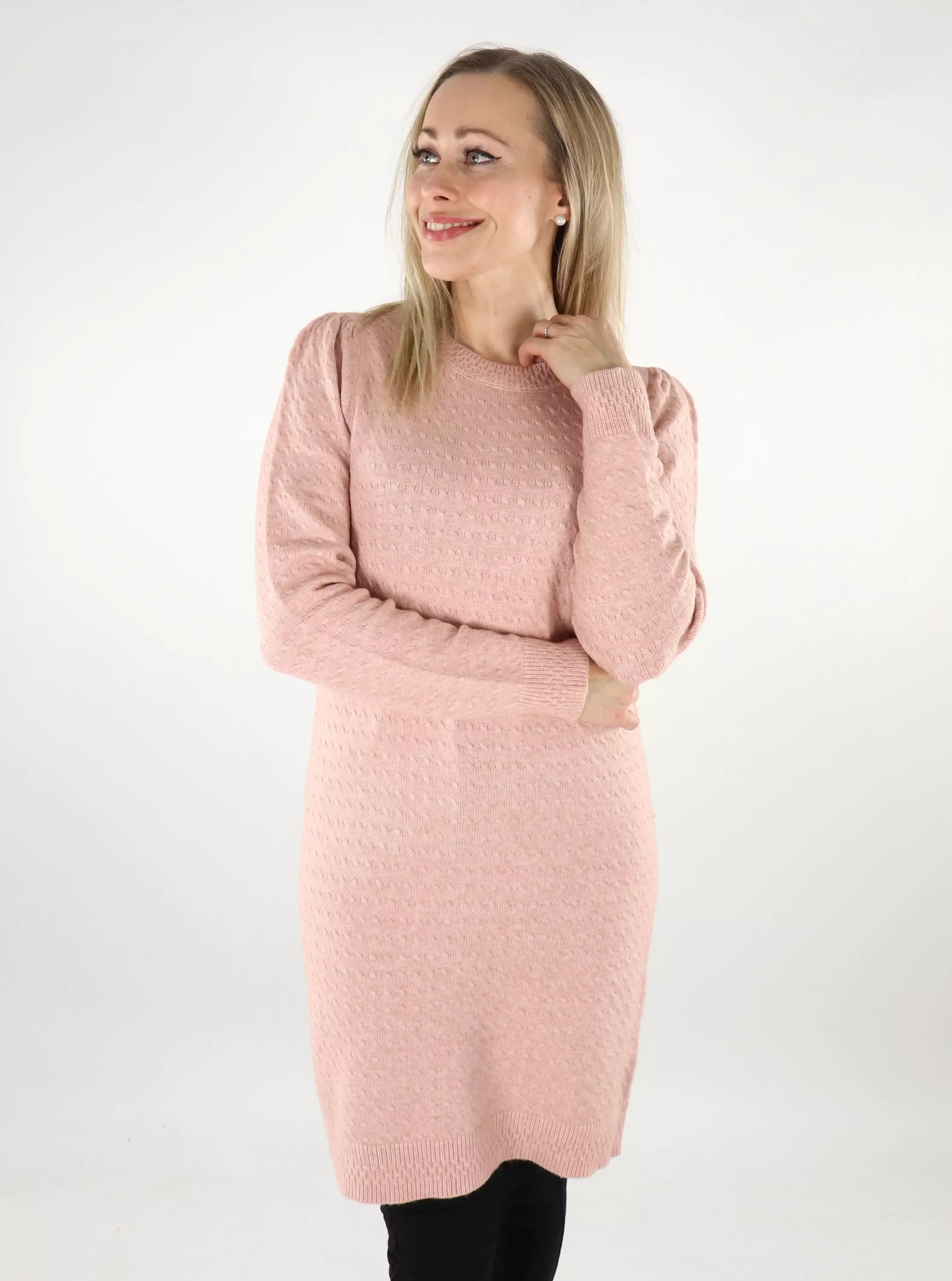 A beautiful knitted dress with a patterned knitted surface and a round neckline. Combine with leggings or thick tights, and you can easily get a stylish and comfortable outfit!