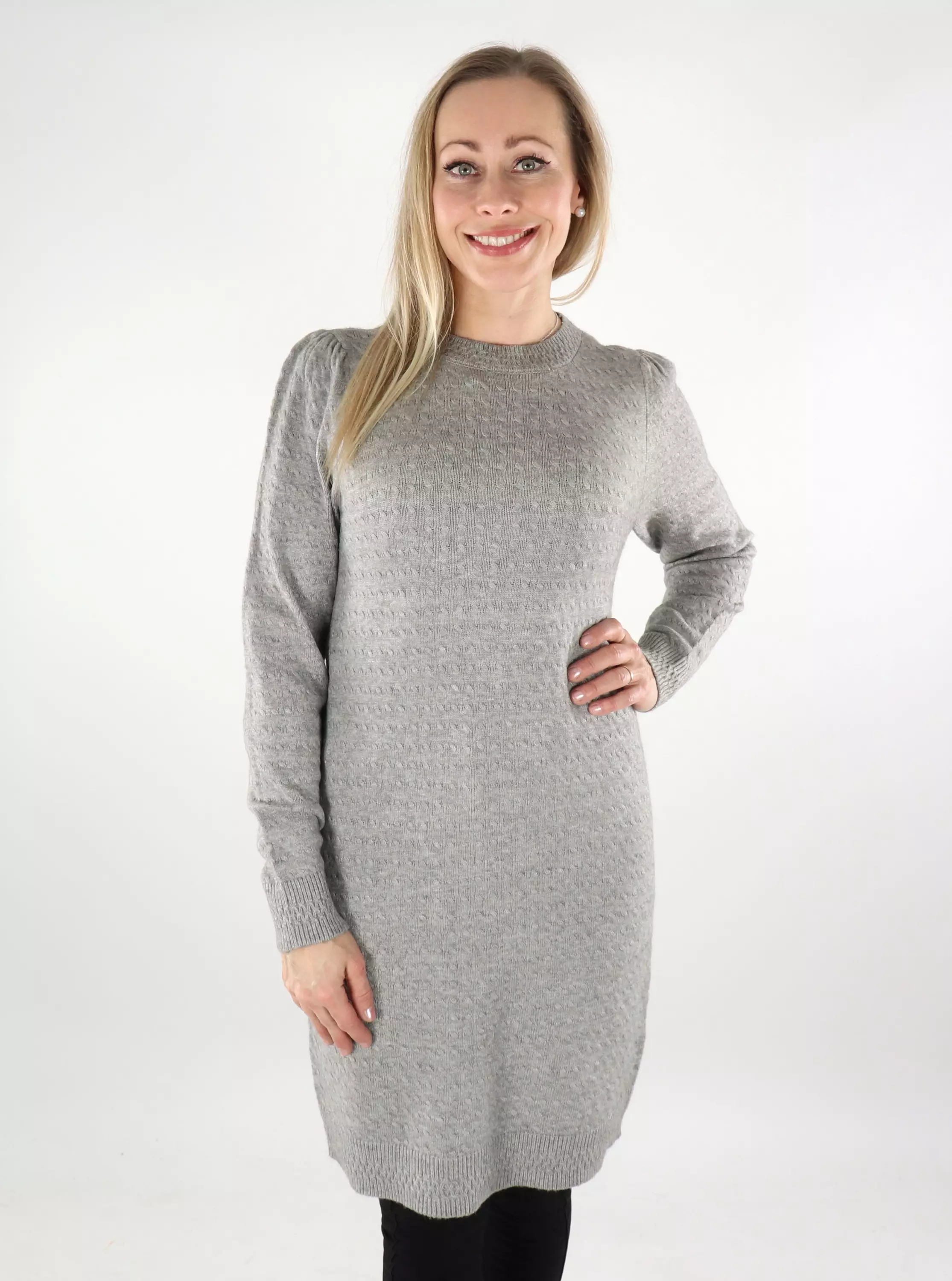 A beautiful knitted dress with a patterned knitted surface and a round neckline. Combine with leggings or thick tights, and you can easily get a stylish and comfortable outfit!