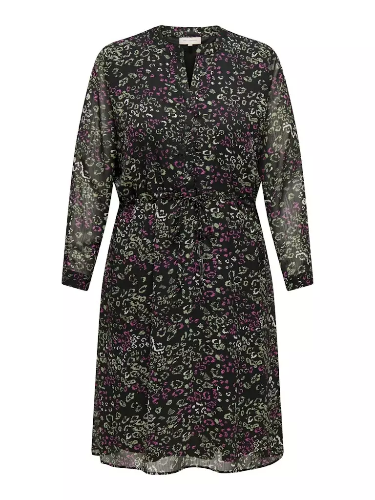 Plus size patterned dress made of light material. Buttoning at the top and drawstring at the waist.
