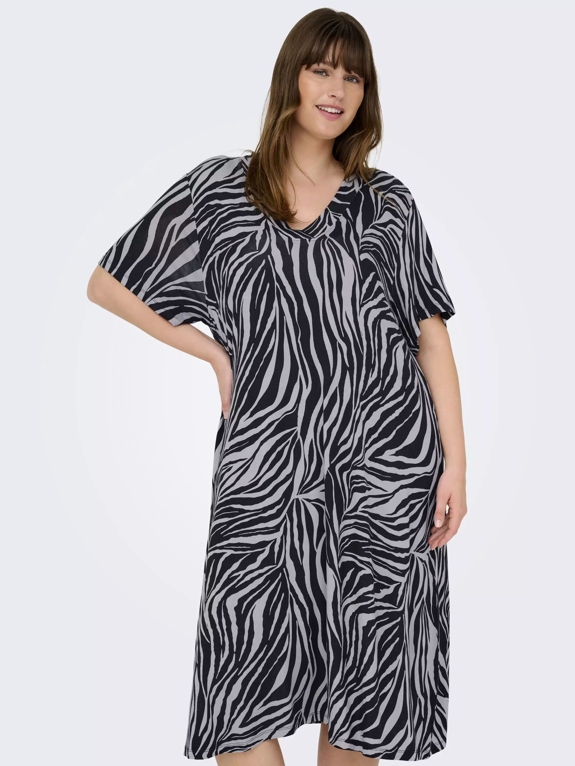 A patterned plus size dress made of a stretchy and breathable viscose-elastane blend.