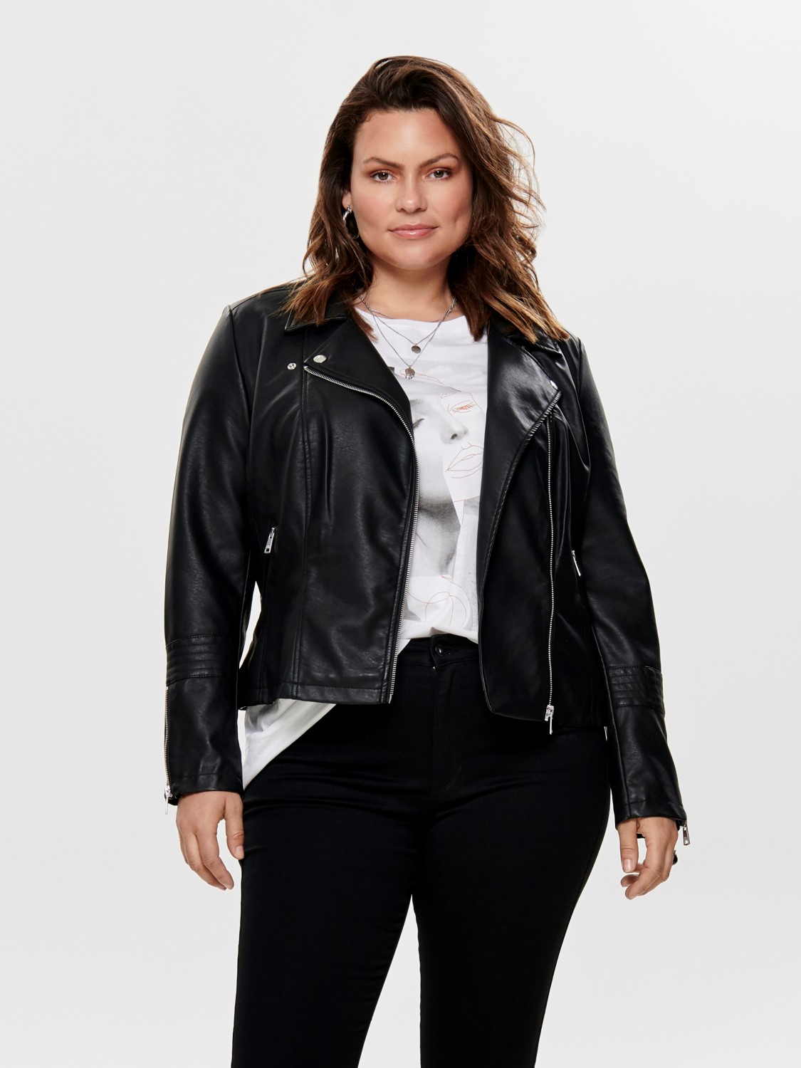Plus-sized biker jacket made of synthetic material.