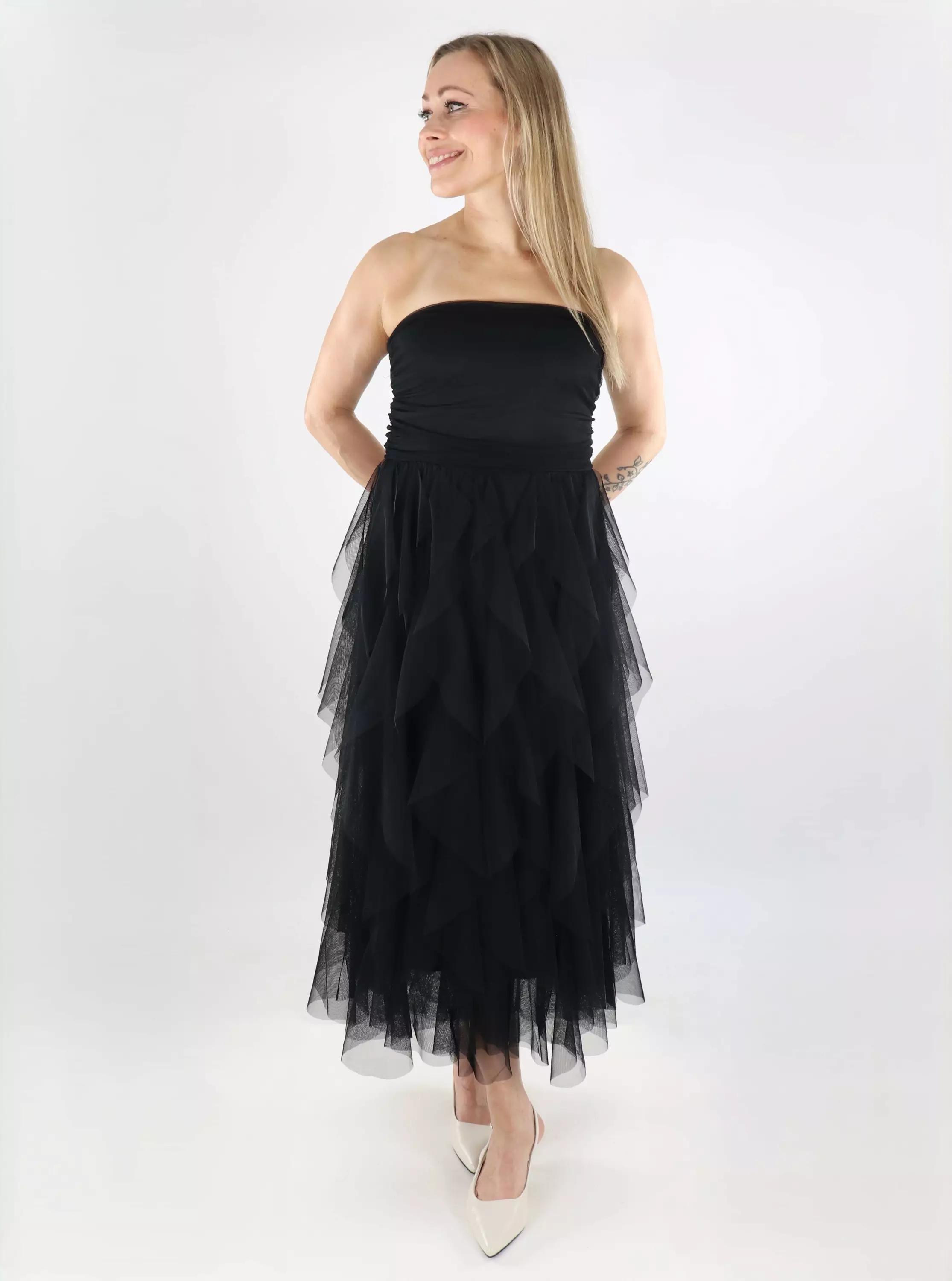 A beautiful long party dress from Only, with a frill hem that creates a striking and feminine silhouette. The stretchy material ensures comfort all day long!