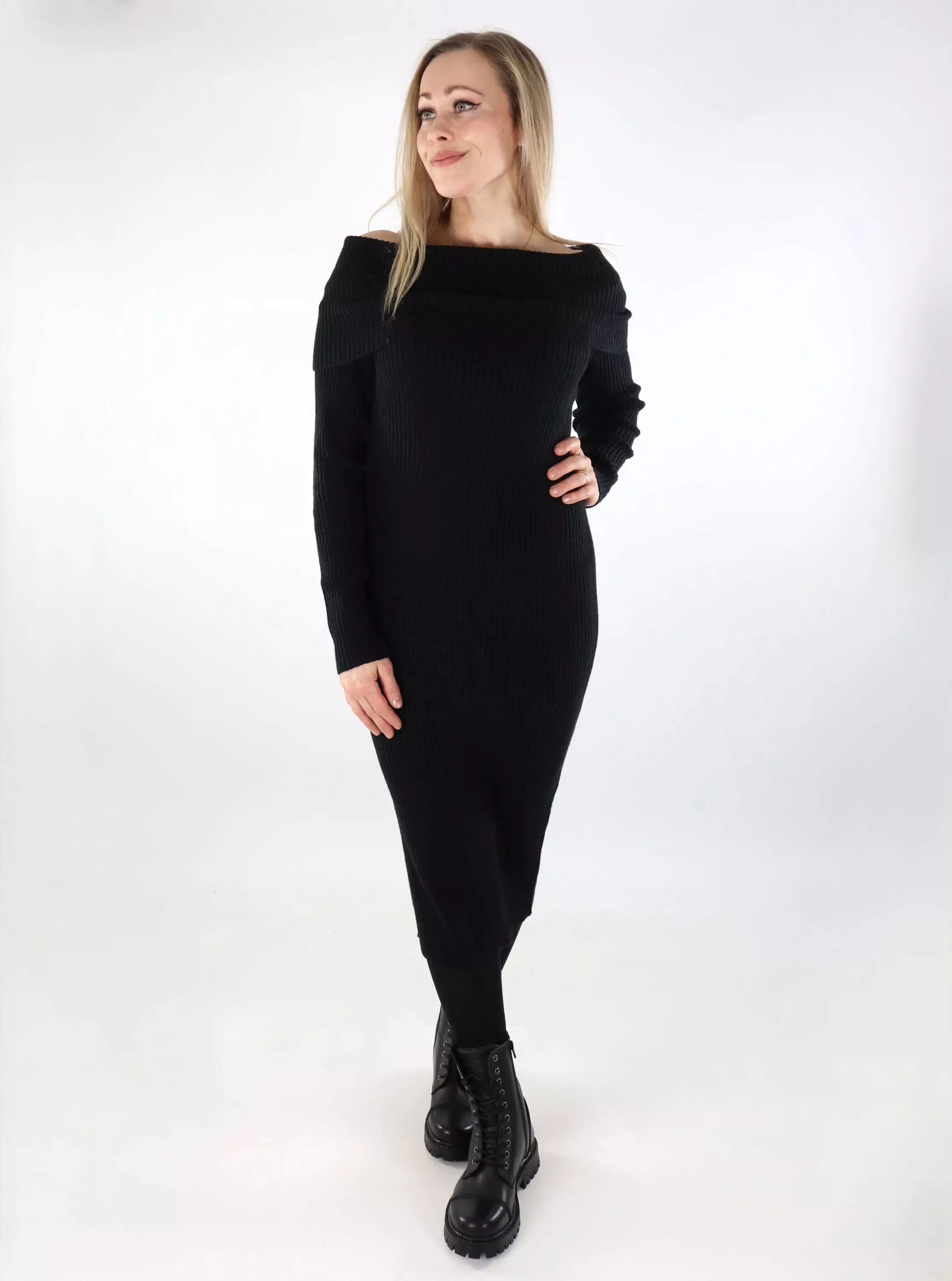 Soft midi-length knitted dress with an off-shoulder neckline. Made of stretchy ribbed knit.