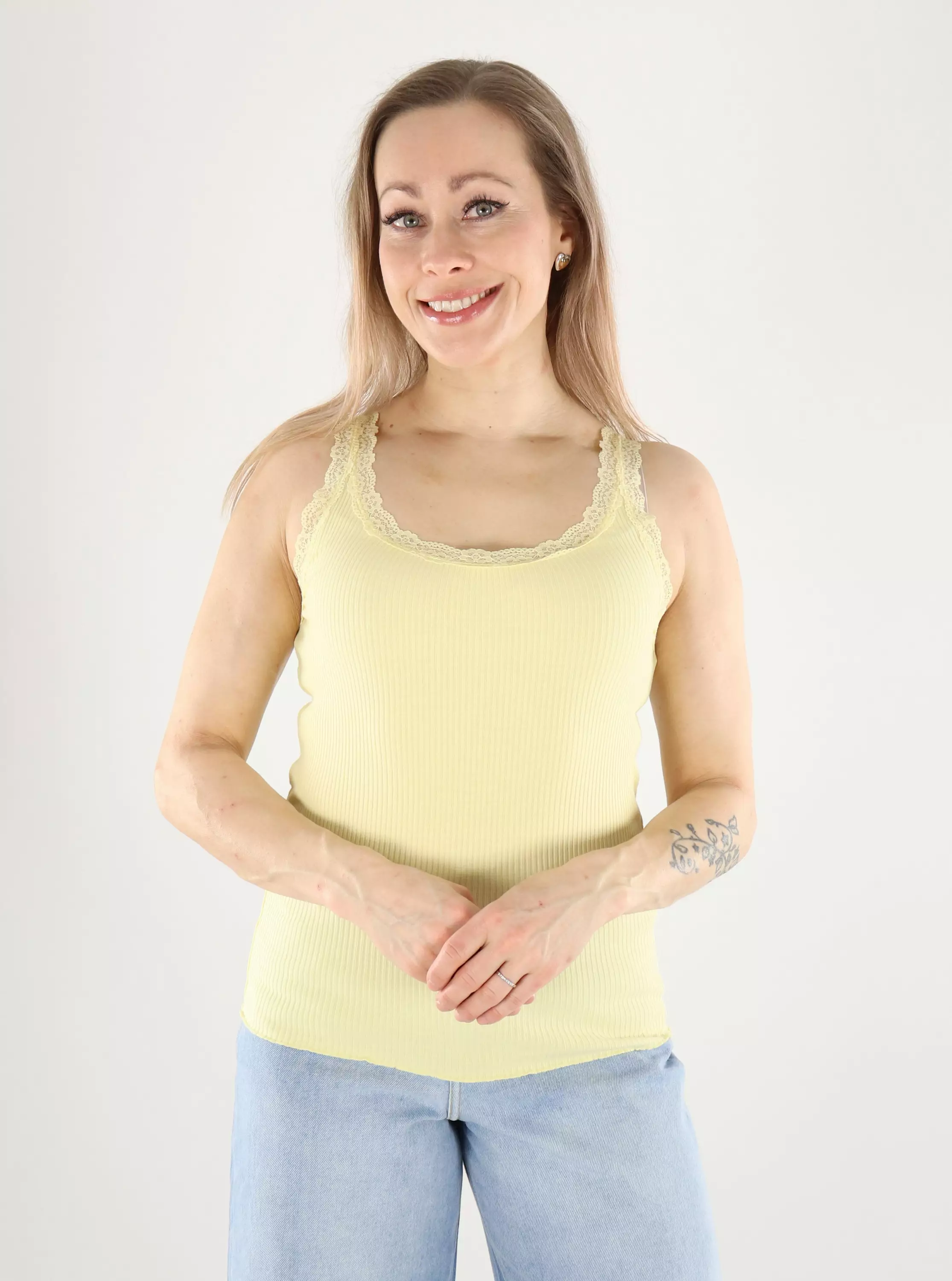 A stylish and versatile ribbed top with a beautiful lace-edged neckline that adds a touch of femininity. The comfortable, stretchy material fits well and feels comfortable all day long. Easy to combine with jeans and skirts!