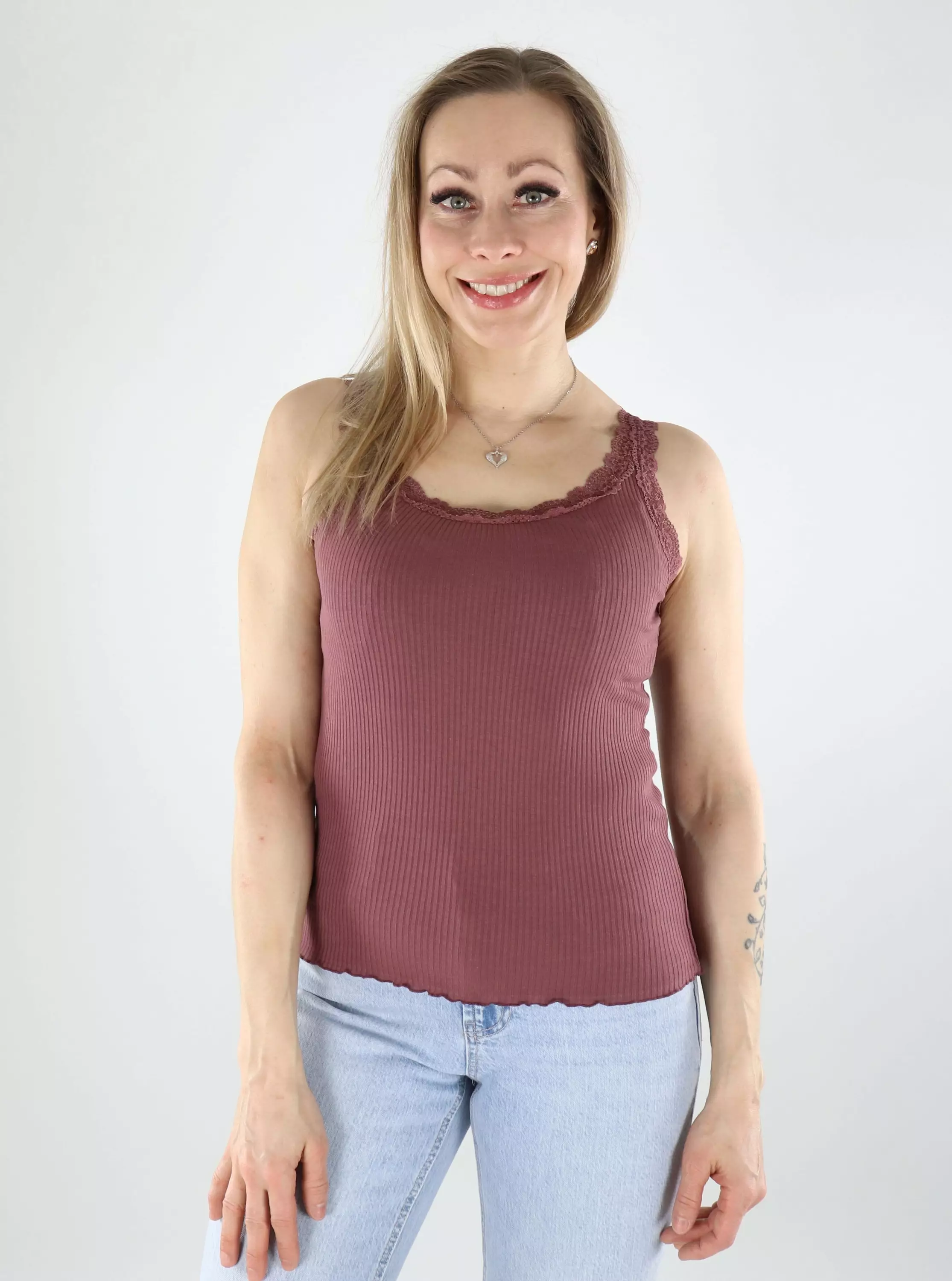 A stylish and versatile ribbed top with a beautiful lace-edged neckline that adds a touch of femininity. The comfortable, stretchy material fits well and feels comfortable all day long. Easy to combine with jeans and skirts!