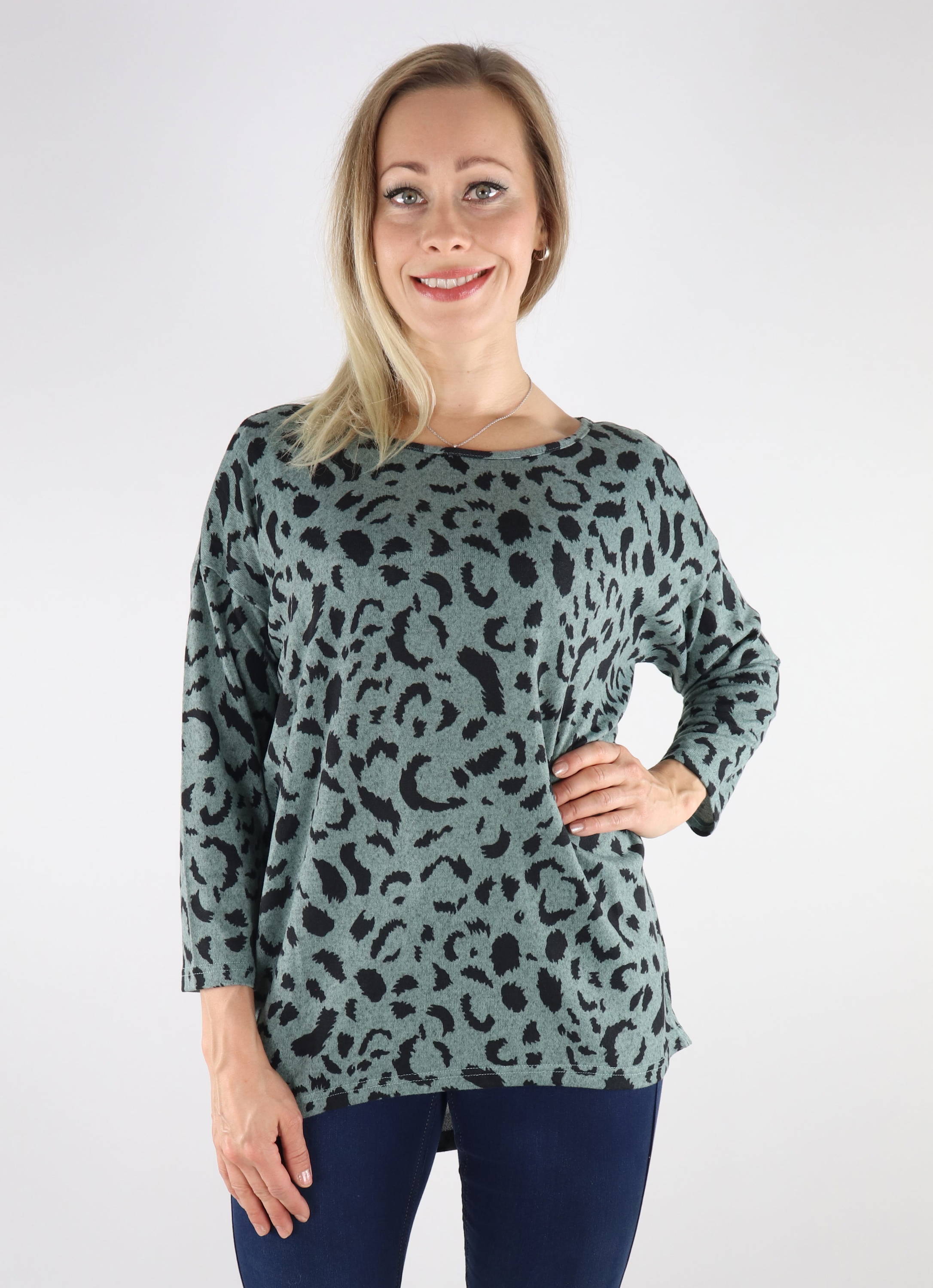 Soft, patterned sweater with 3/4 sleeves and rounded hem, longer from the back.
