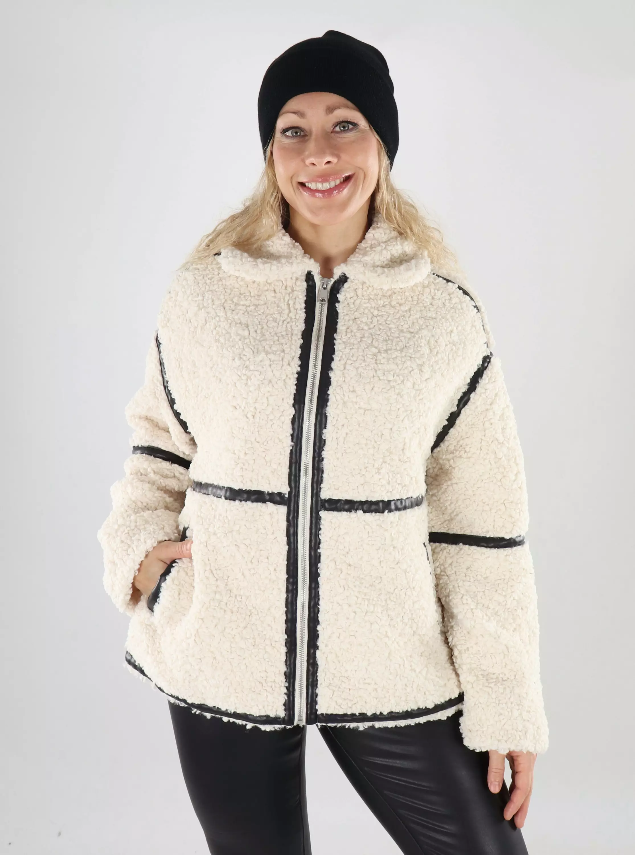 This soft teddy jacket brings warmth and trendiness to your outfit! The off-white shade is easy to combine with different styles, and the side pockets add practicality. The perfect choice for cooler days.