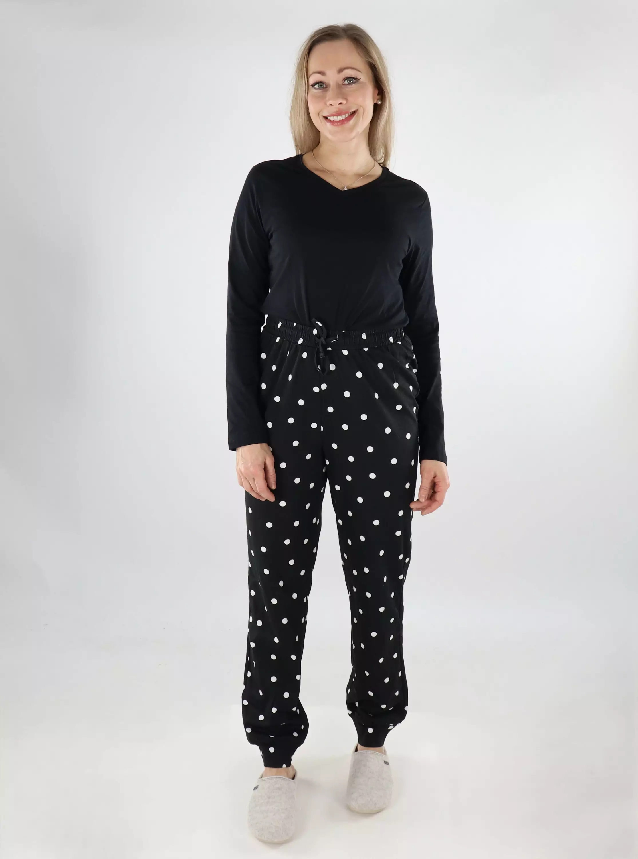 Women's soft cotton pajamas with single color top and patterned pajama bottoms.