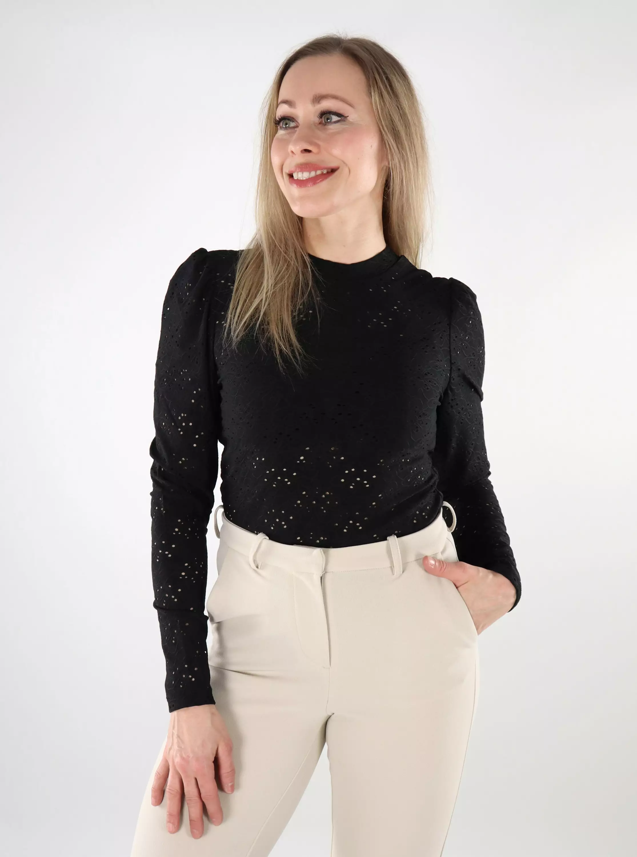 Women's hole-patterned, body-hugging shirt that is easy to style for everyday wear or for a party! Made of a really stretchy material.