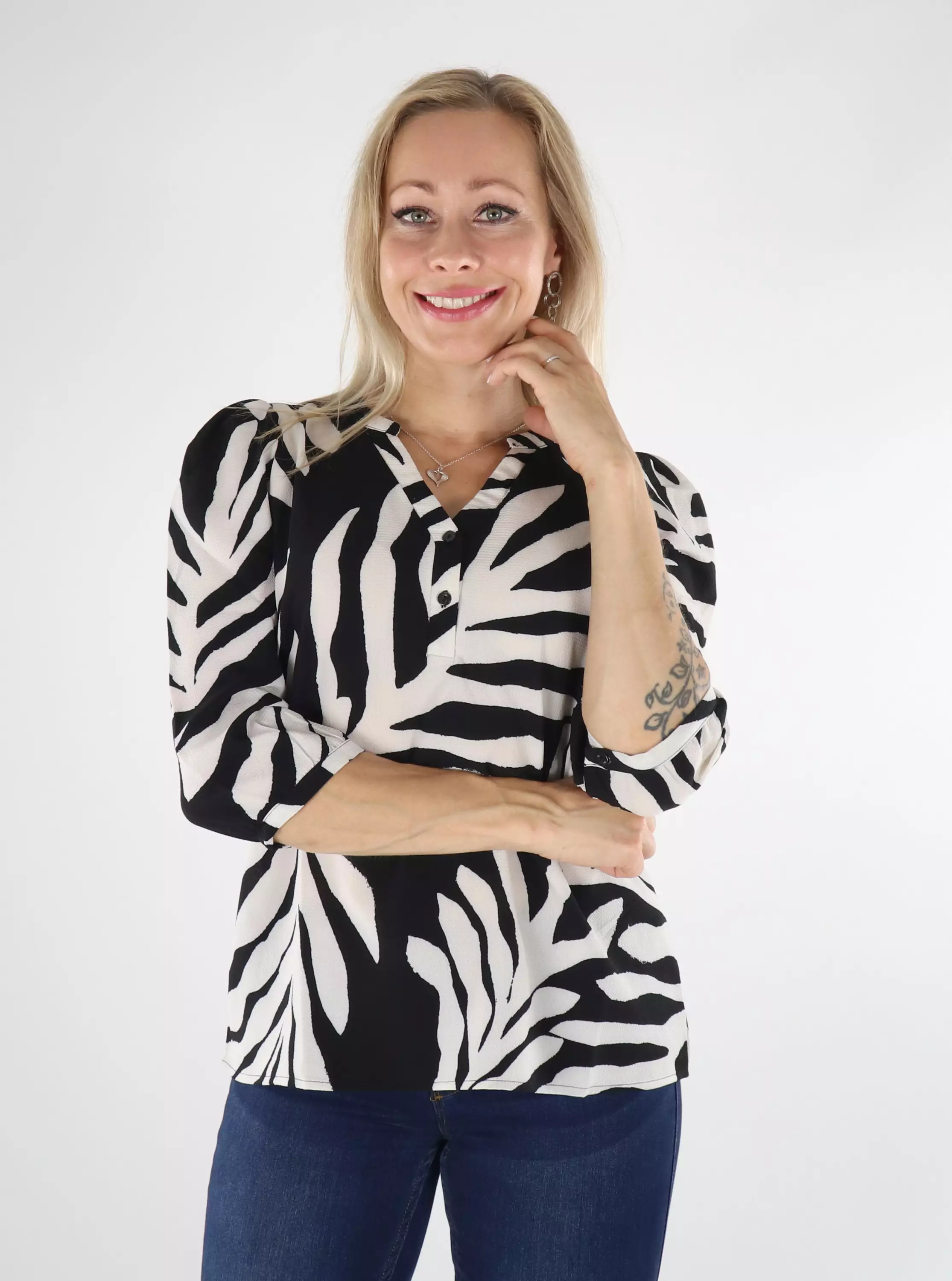- 3/4-length sleeves, slit and button on the cuffs
