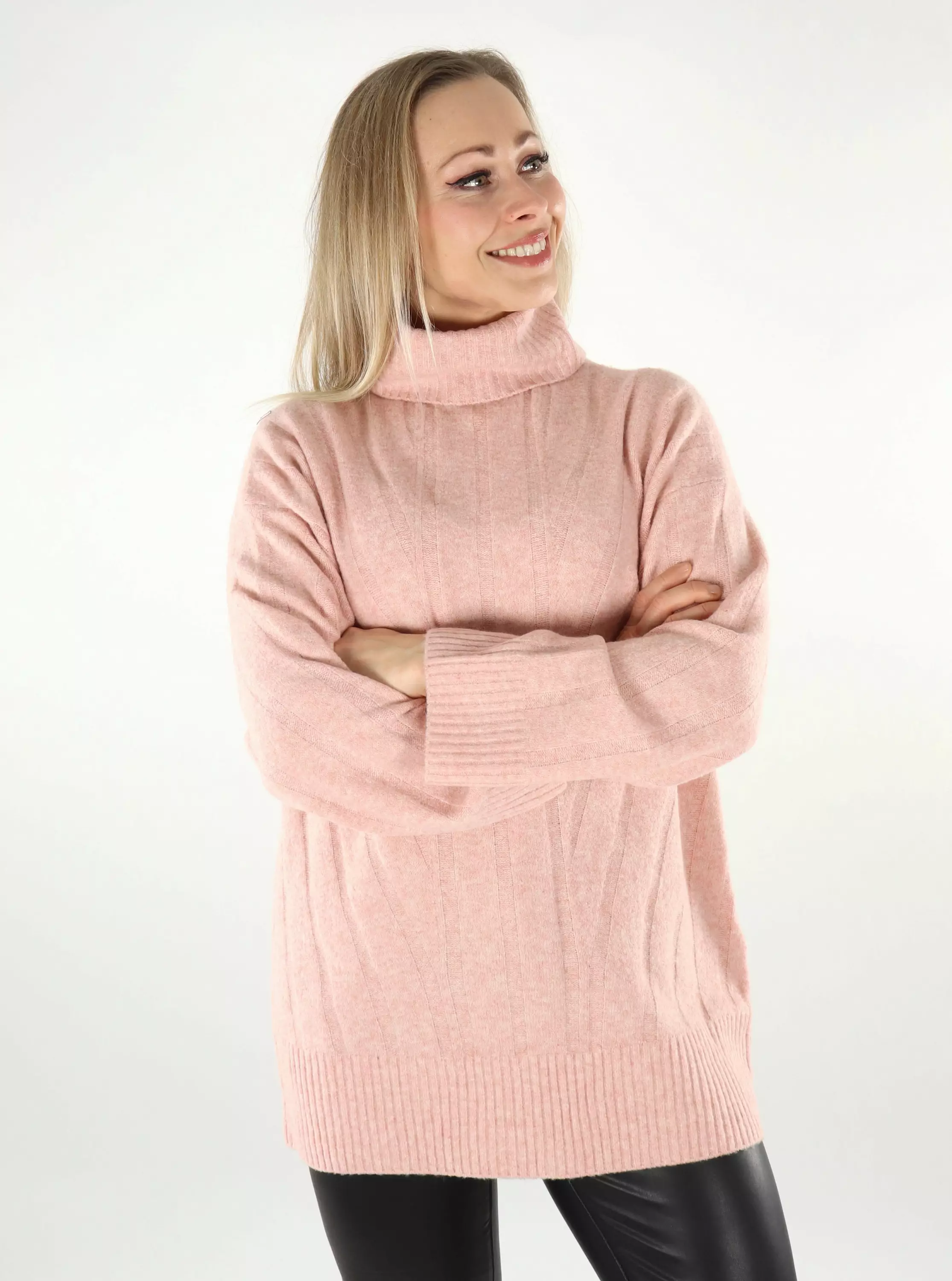 A really soft sweater with a high collar and relaxed sleeves. Suitable to combine with both jeans and leggings!
