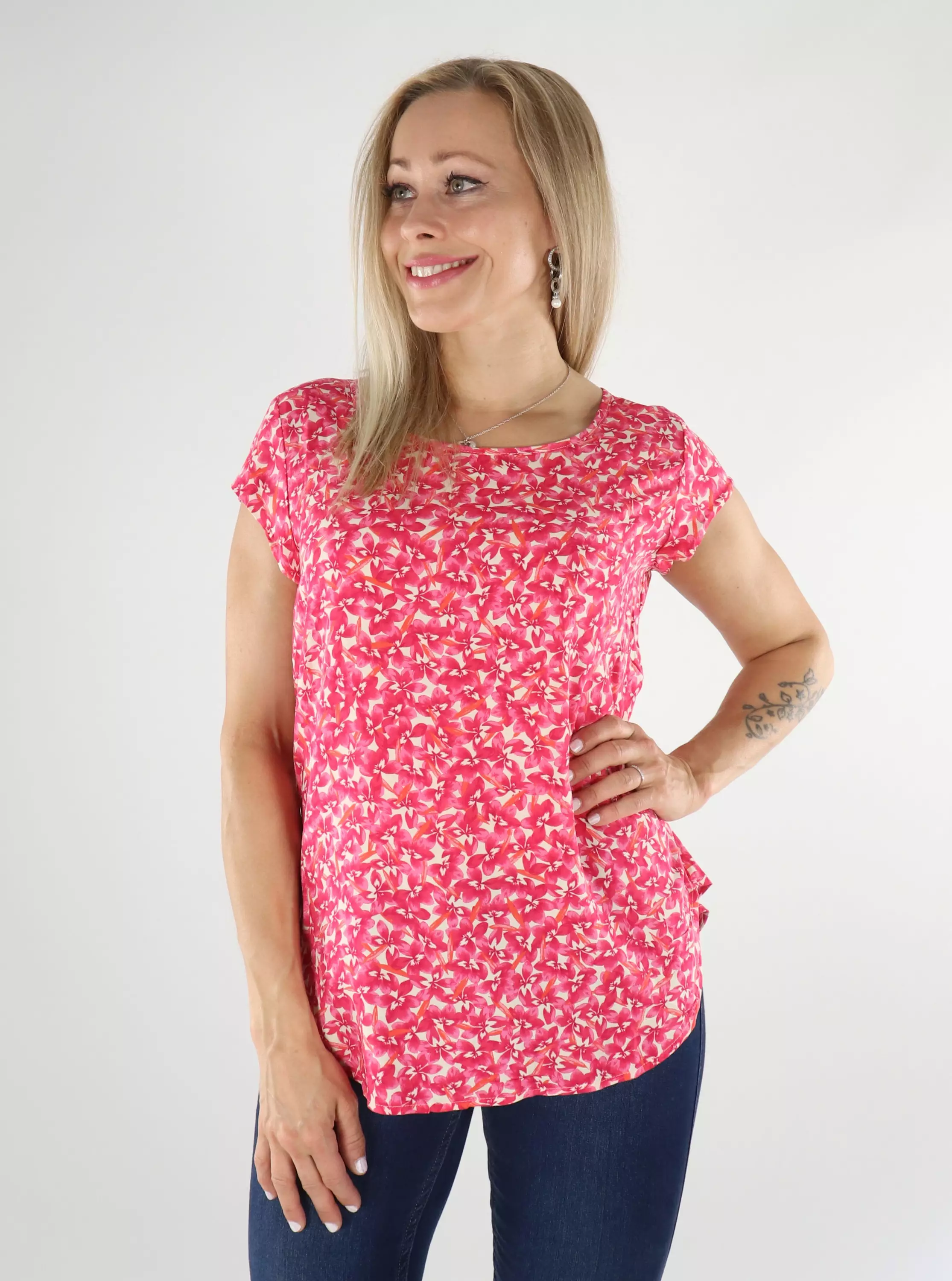 A light floral shirt with a rounded, slightly longer hem.