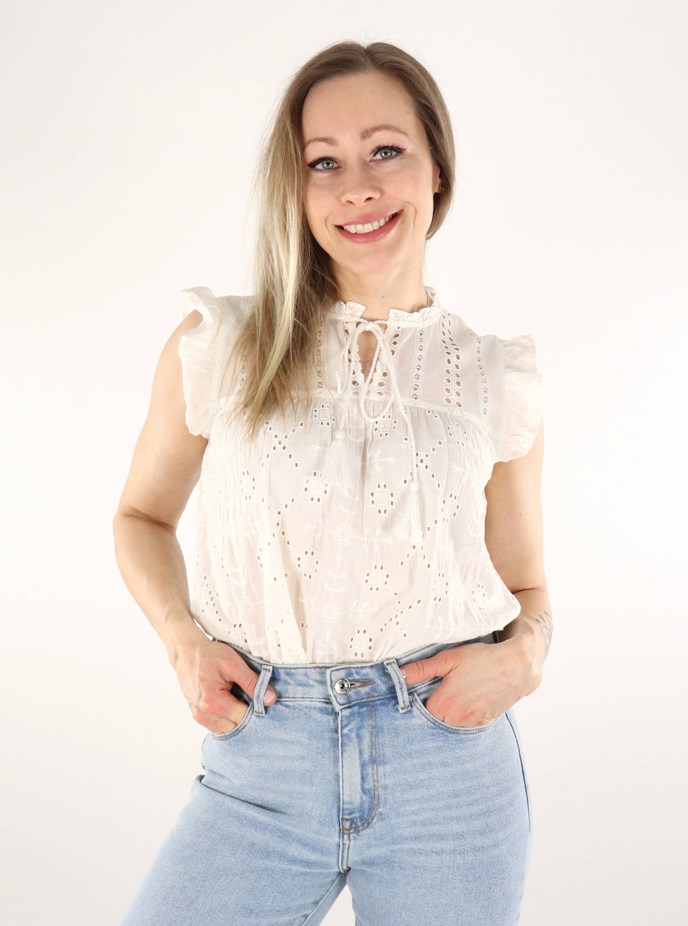 Boho-inspired cotton top with tasseled cords that tie at the neckline.