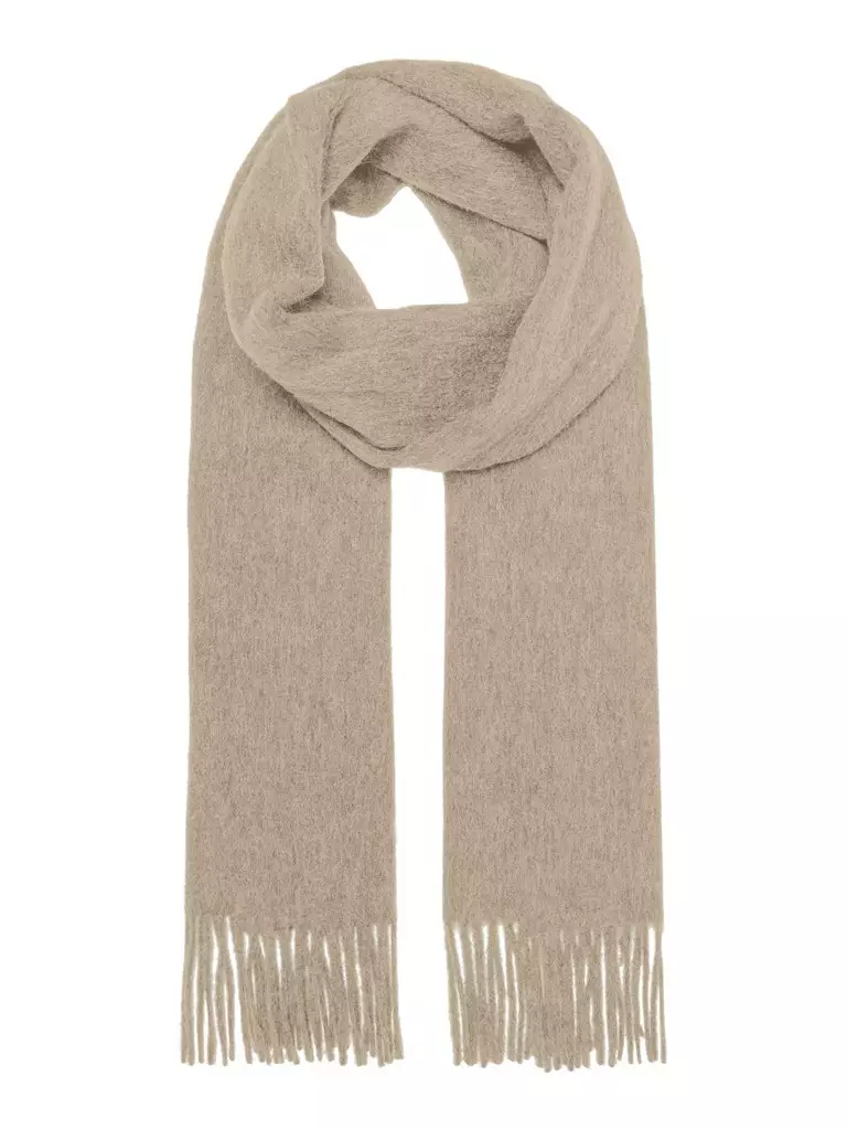 A scarf made of 100% sheep's wool with fringes at the ends.