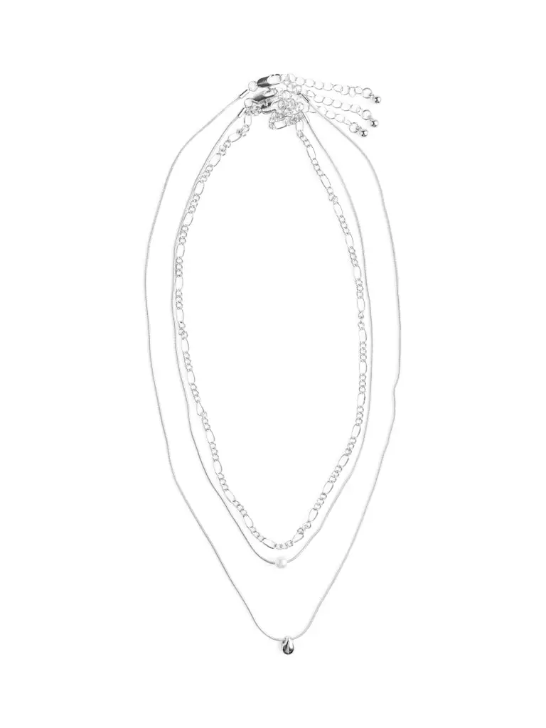 A stylish silver-colored 3-pack jewelry set with three necklaces of different lengths. Perfect for combining together or wearing individually.