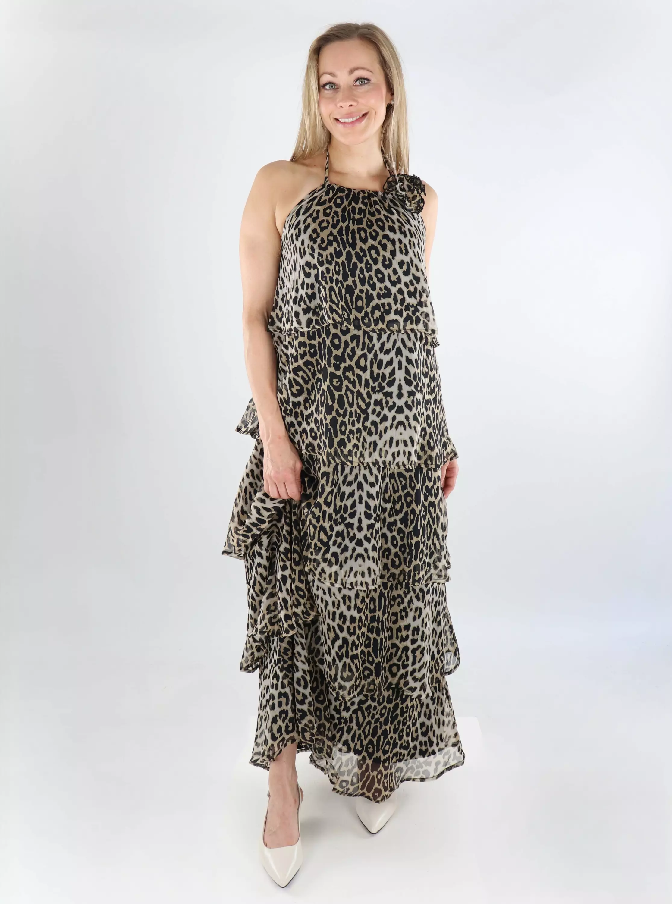 Pieces leopard print long dress with a layered frill hem for a light and striking look. The floral detail on the neckline finishes the dress off elegantly!
