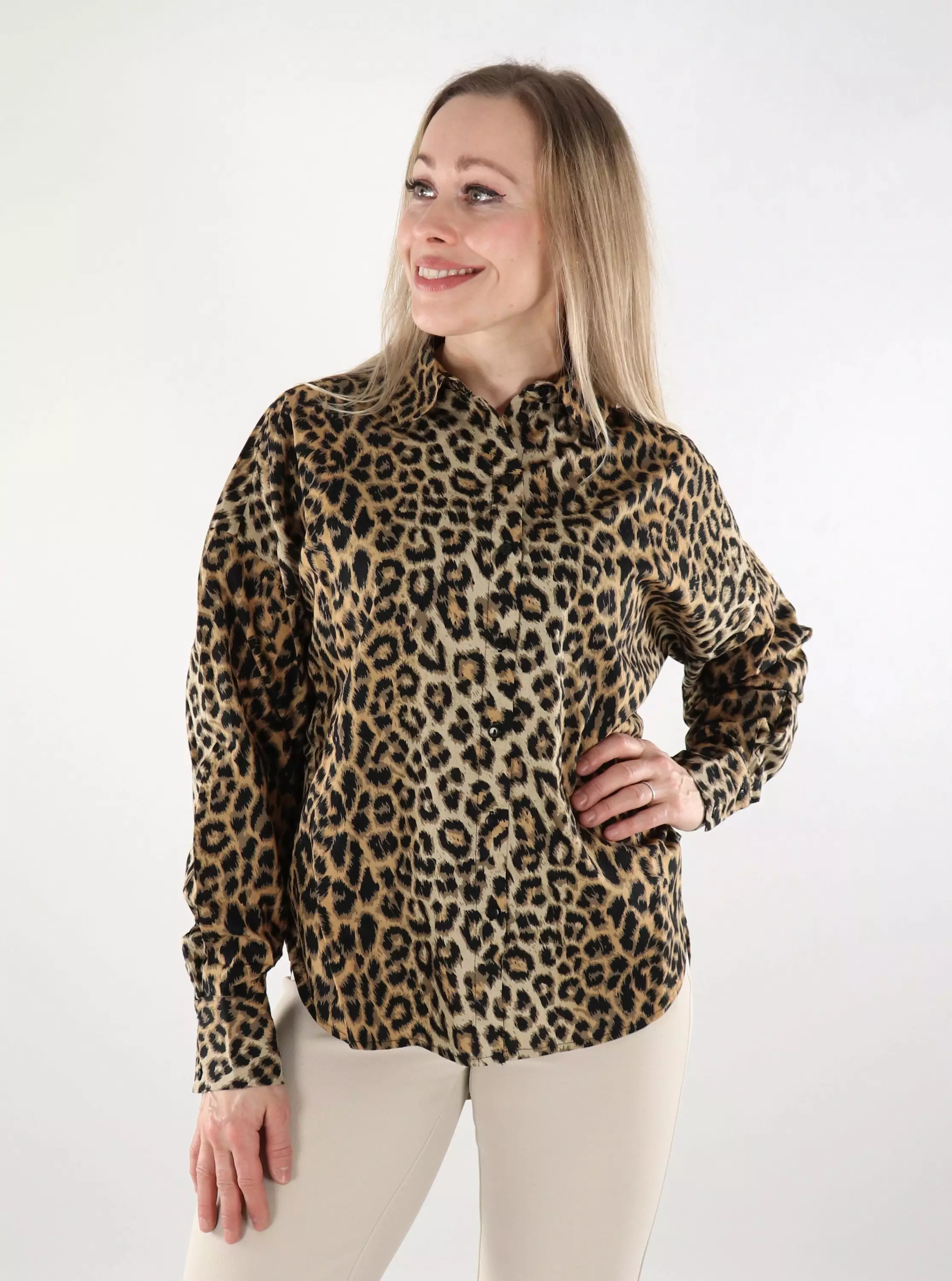 Leopard print, relaxed fit shirt with a rounded hem and slightly longer at the back.