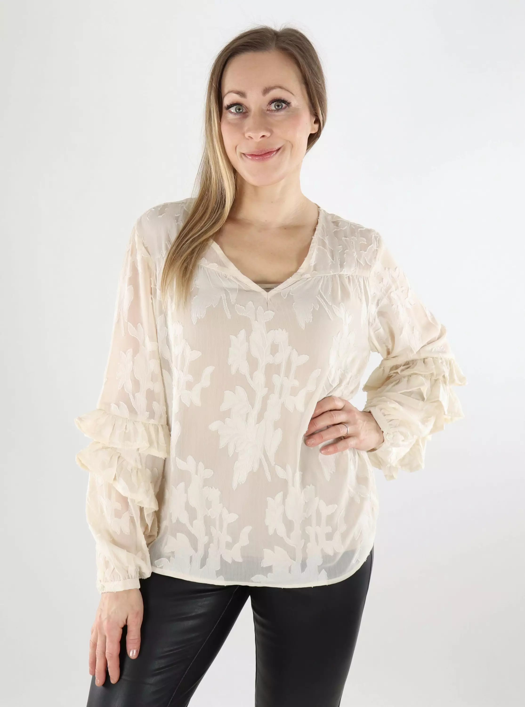 Pieces' translucent shirt with floral patterns and a feminine V-neck. Perfect for both everyday wear and parties!