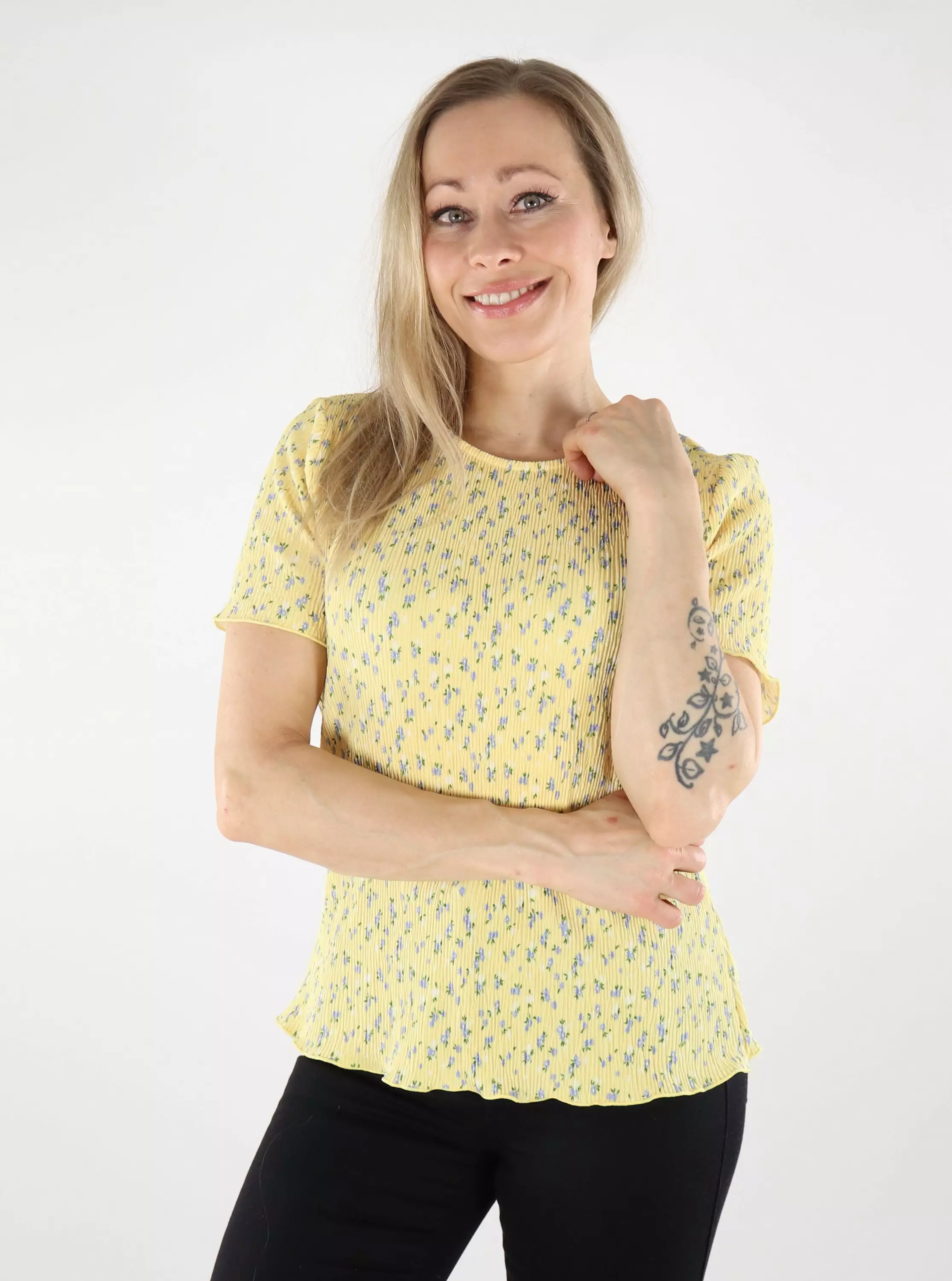 Pleated fabric and a cheerful yellow tone give this Pieces t-shirt a fresh look! The perfect choice for everyday wear, vacations and parties.