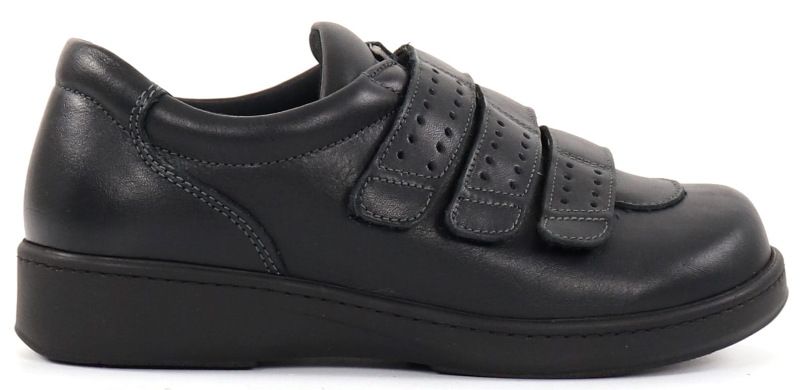 Leather walking shoes with wide lasts, velcro fastening and removable insole. Class 1 of assistive device and medical device.