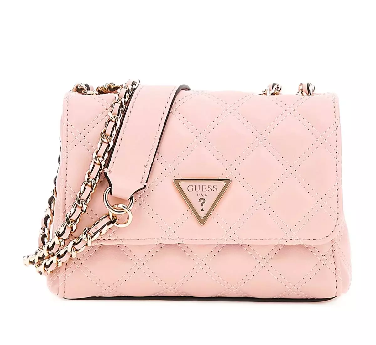 Kaunis vaaleanpunainen Guess-laukku tikatuilla yksityiskohdilla.
