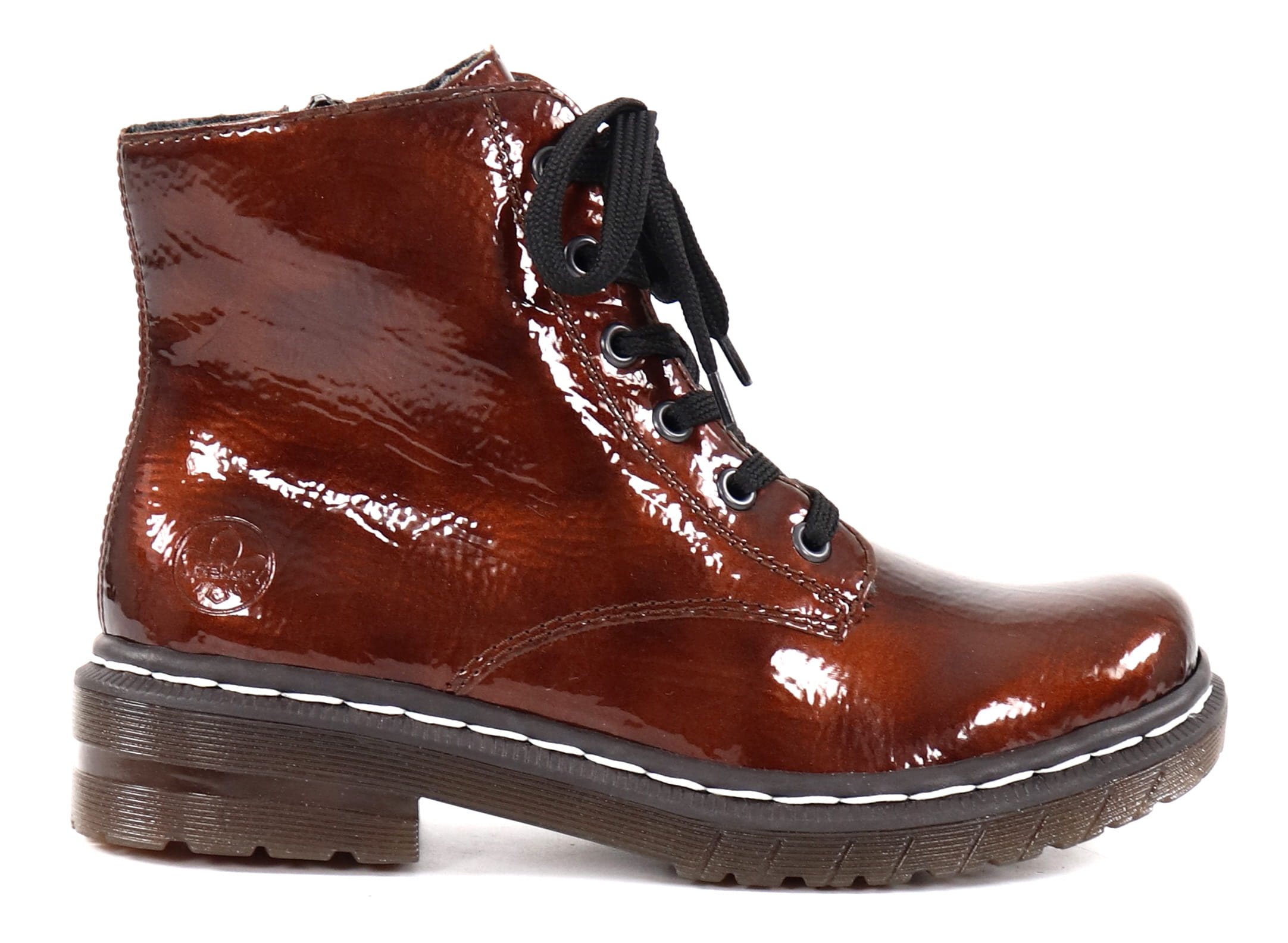 Military boot styled shiny ankle boots with thin faux fur lining.