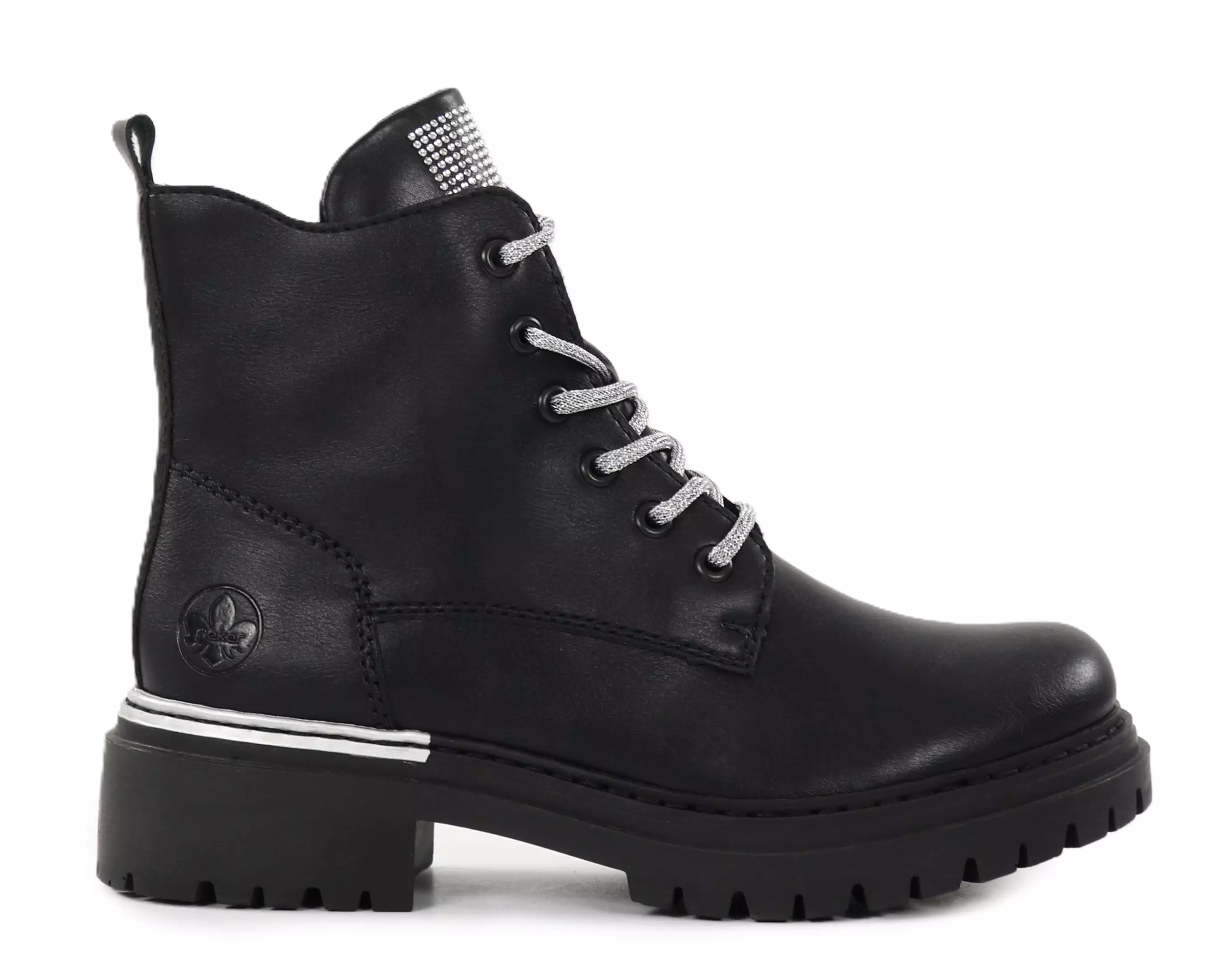 These striking Rieker ankle boots combine a rugged wedge model with feminine sparkle. Silvery laces and rhinestone decorations add just the right amount of sparkle. The warm and lightweight faux fur lining ensures a comfortable feel even in colder weather.
