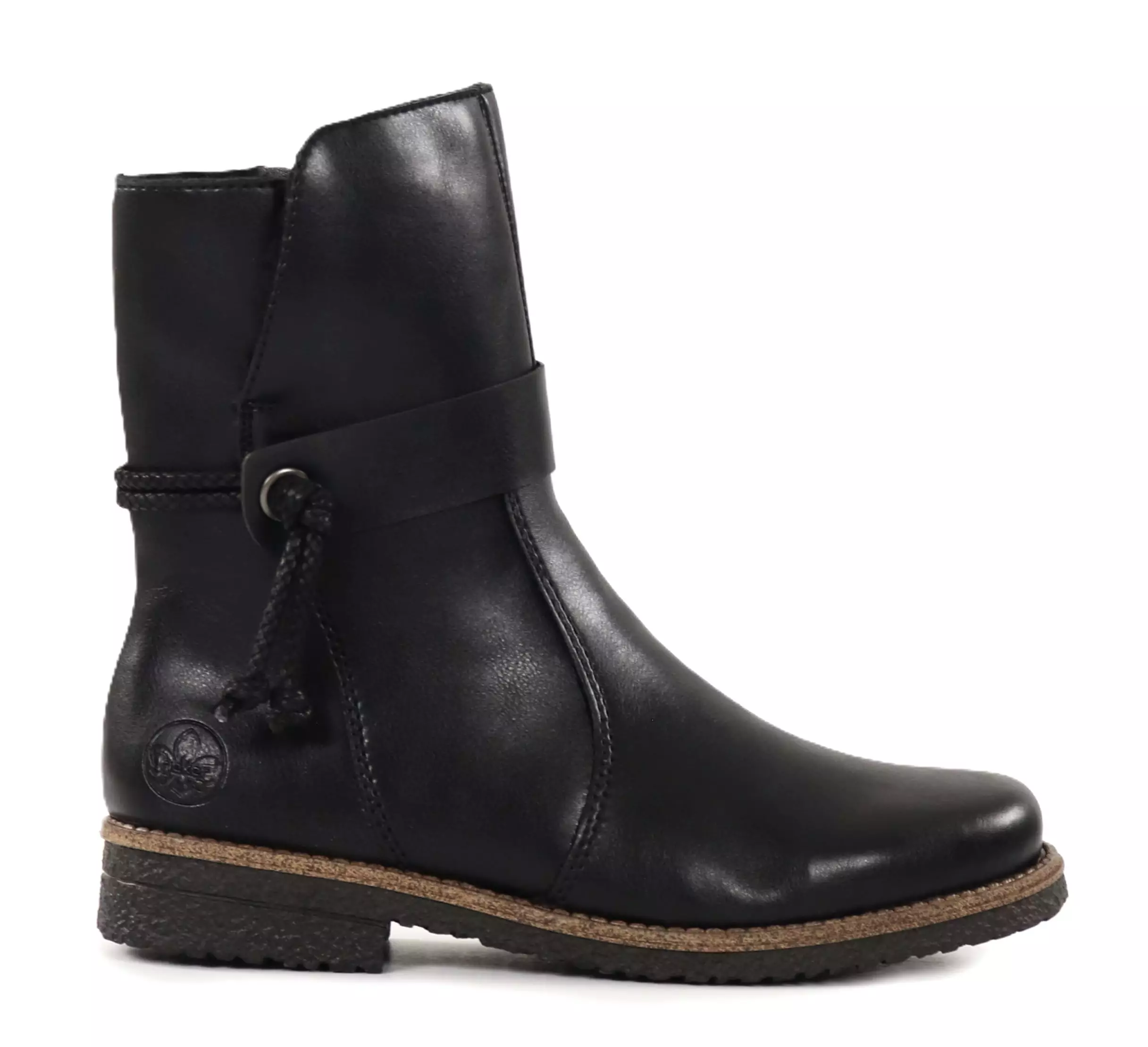 Stylish and practical Rieker ankle boots with a warm teddy lining and felt insoles. The strap detail on the outer edge gives the shoes a look!