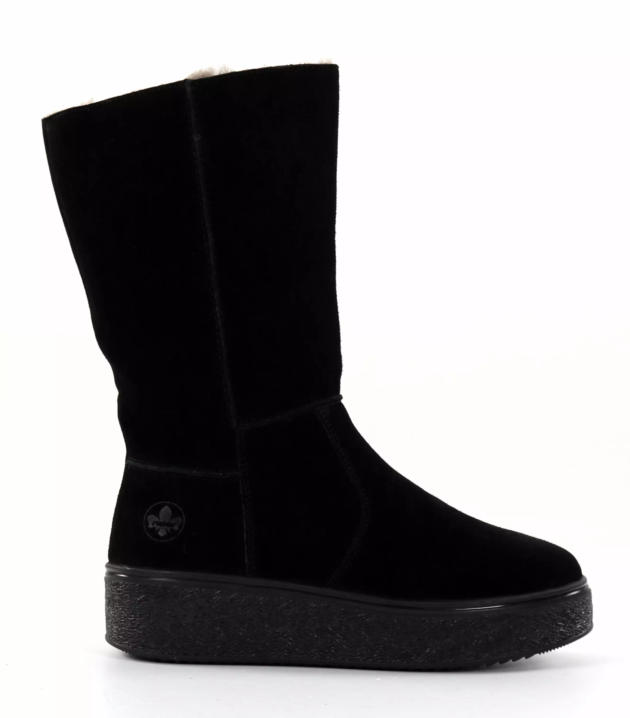 Suede Rieker ankle boots with a warm sheep wool lining. Zipper and elastic gusset on the side.