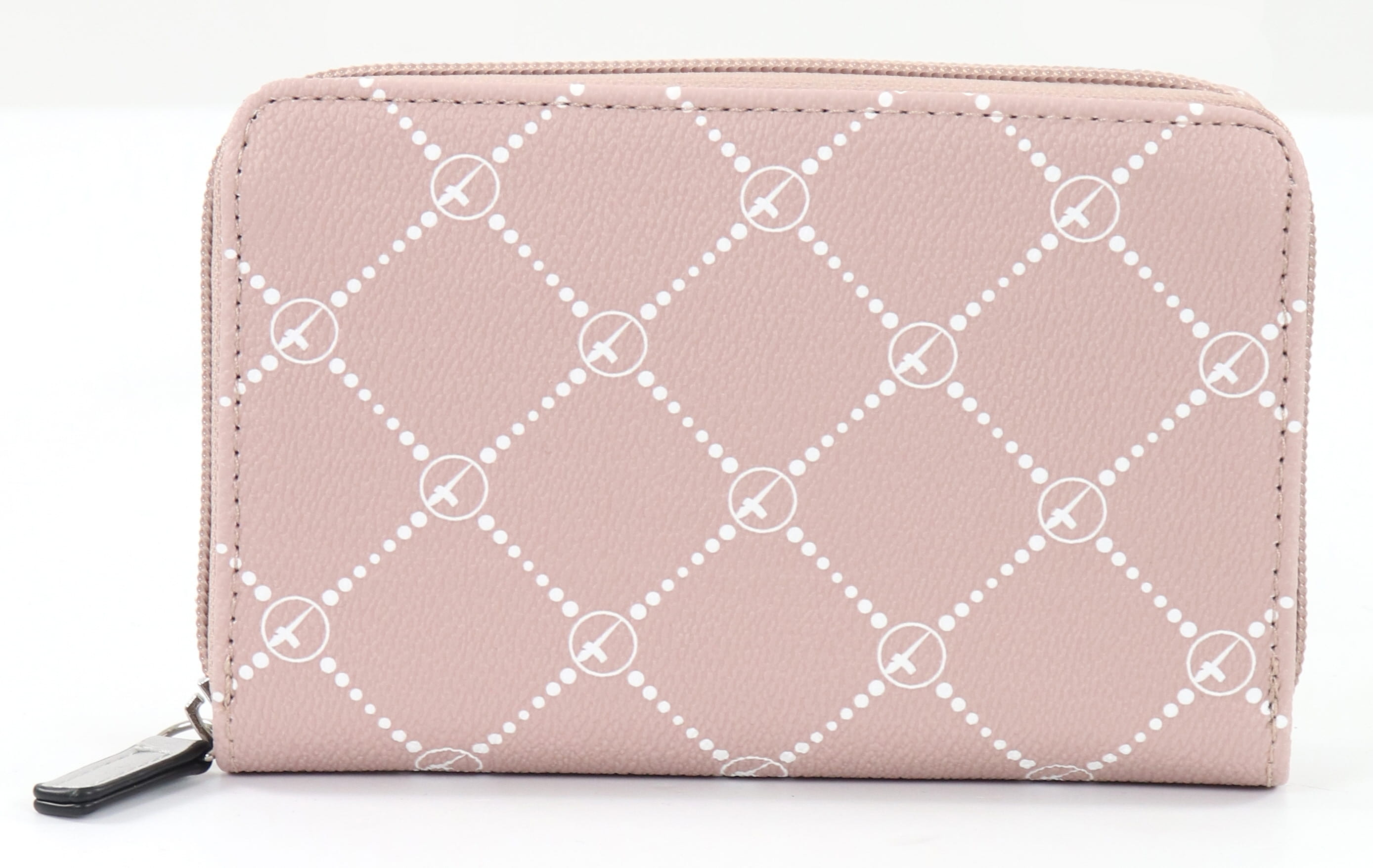 Patterned synthetic material wallet with zipper closure.