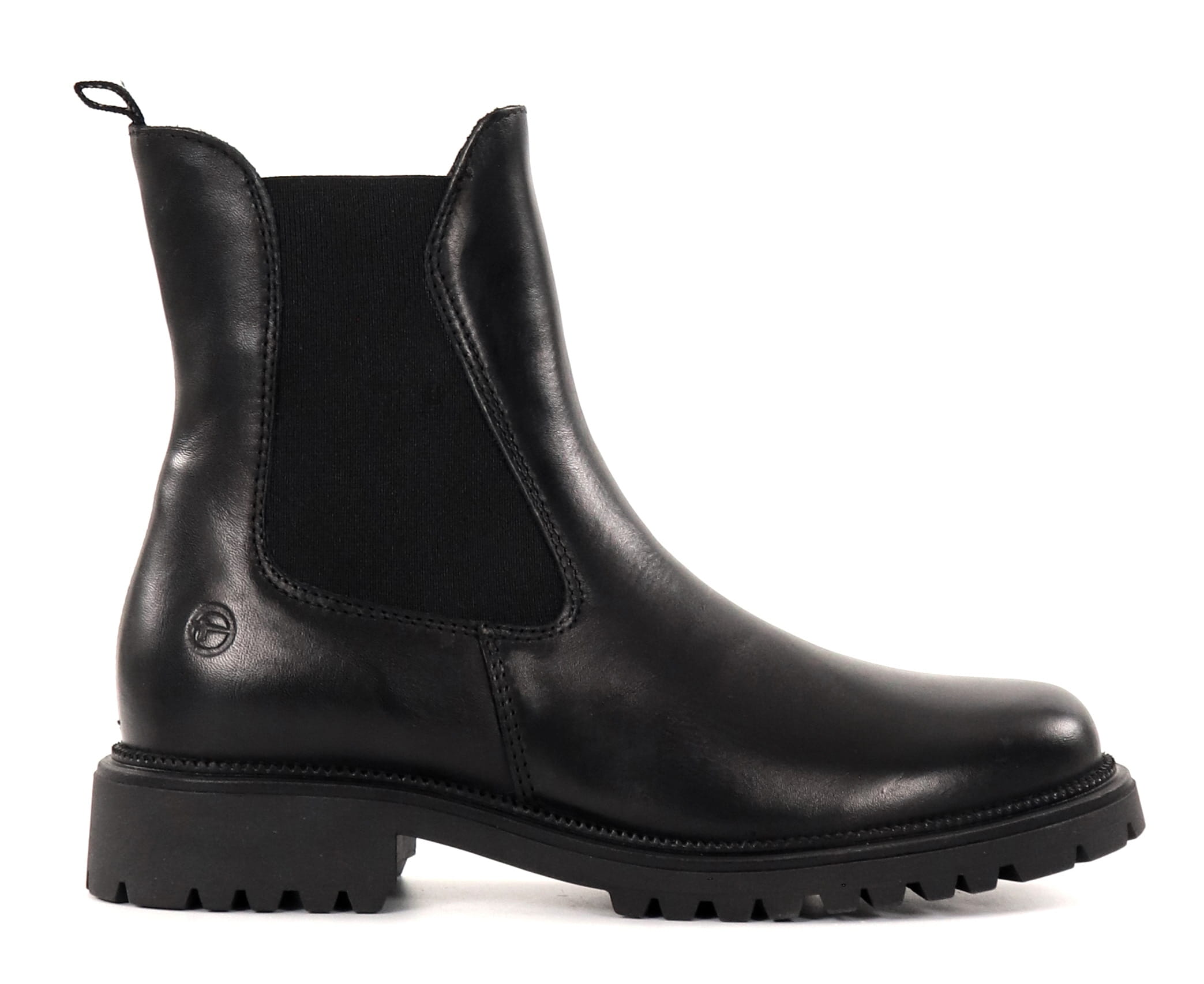 Stylish leather ankle boots by Tamaris with elastic gussets and a soft artificial fur lining.