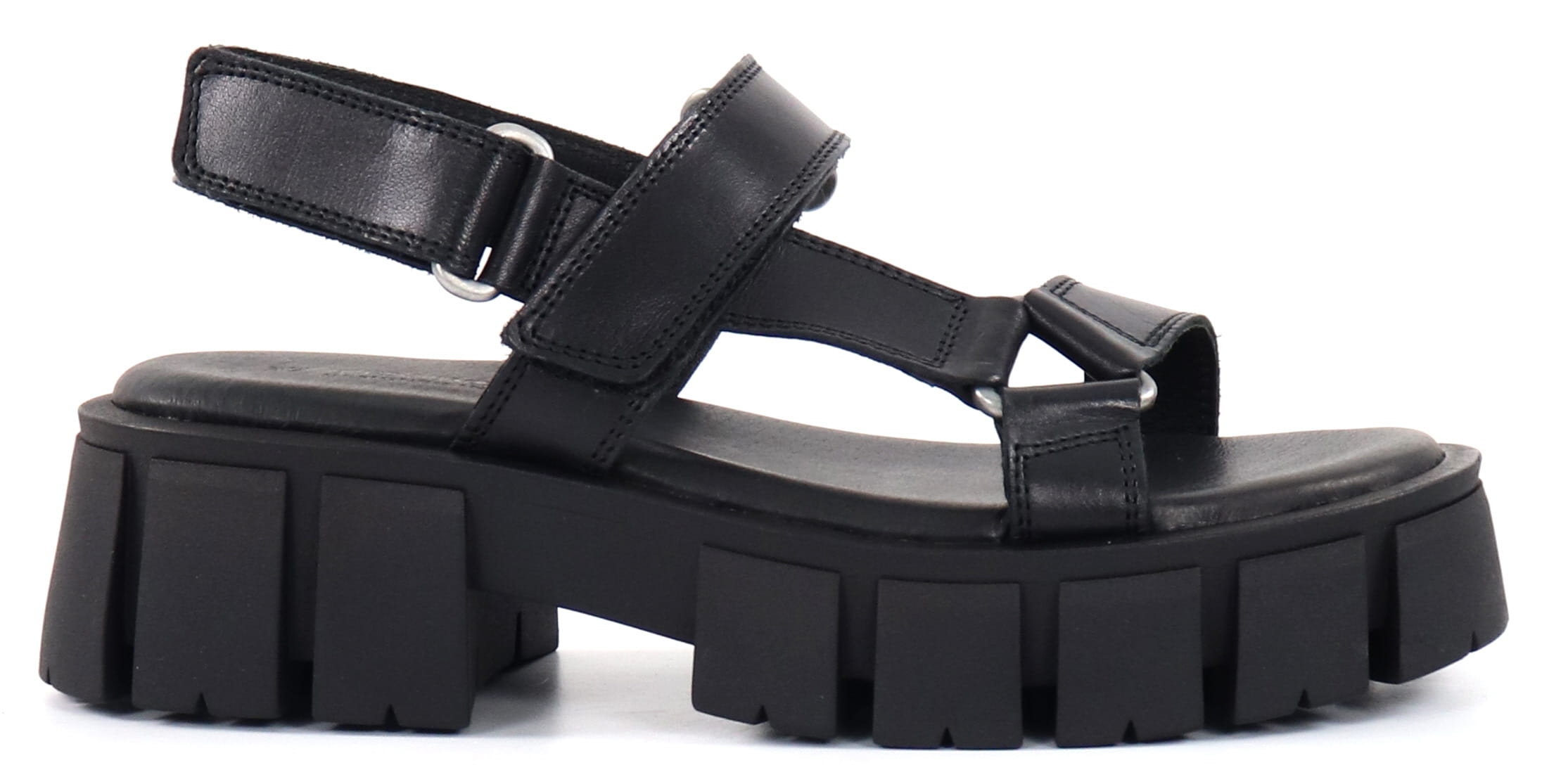 Thick-soled leather sandals with velcro fastening.