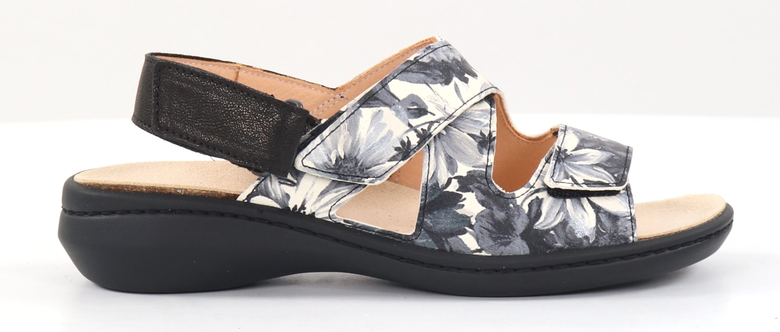 Flower patterned leather work sandals with adjustable velcro straps.