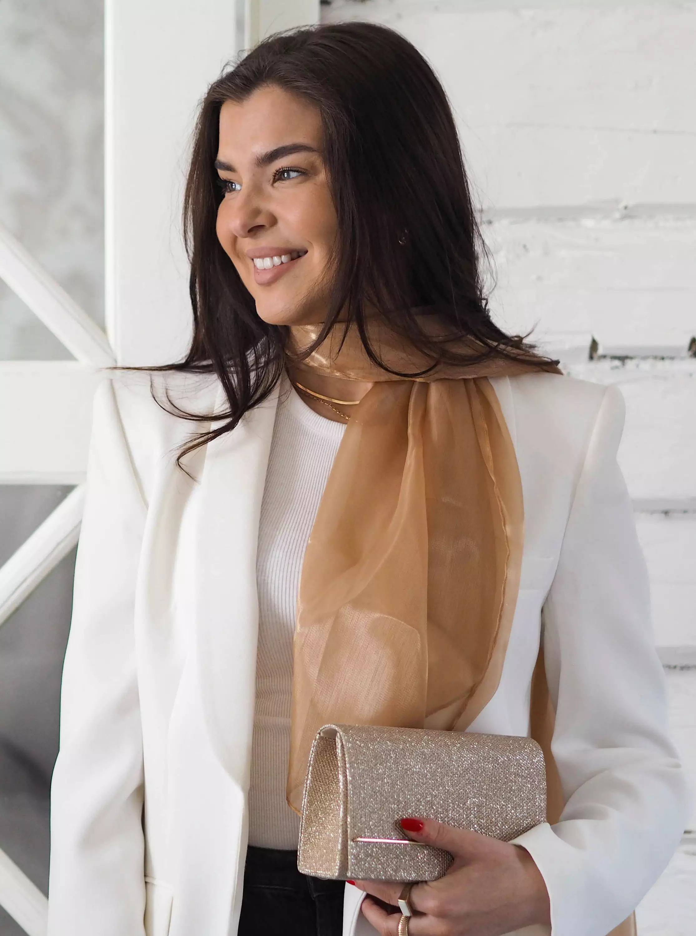 Veniz's gold chiffon scarf is the perfect choice for party outfits. The light and beautifully flowing scarf is perfect as a shoulder scarf, adding a sophisticated and feminine look to festive occasions.