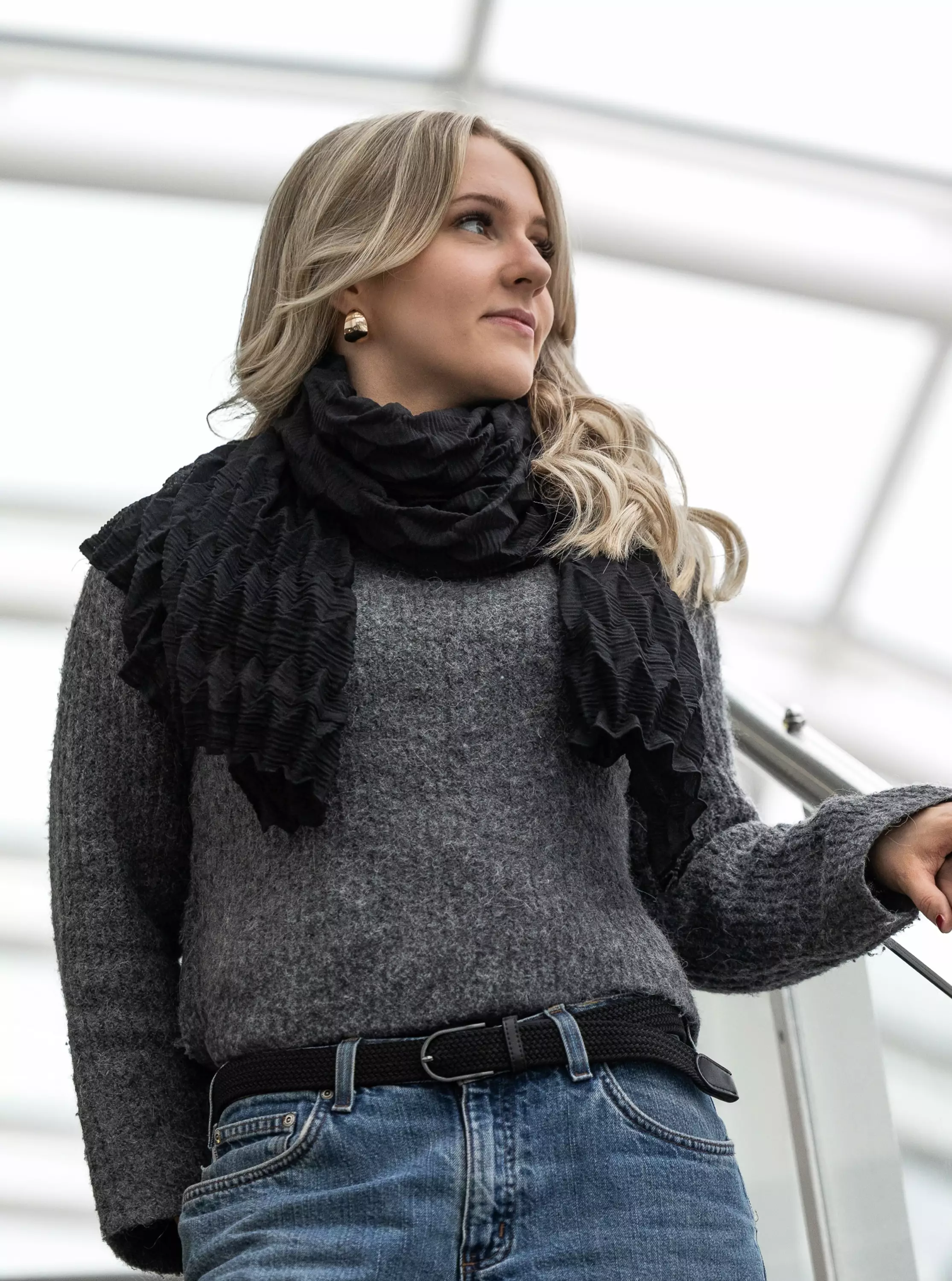 A pleated scarf made of lightweight material. Easy to combine with both indoor and outdoor outfits!