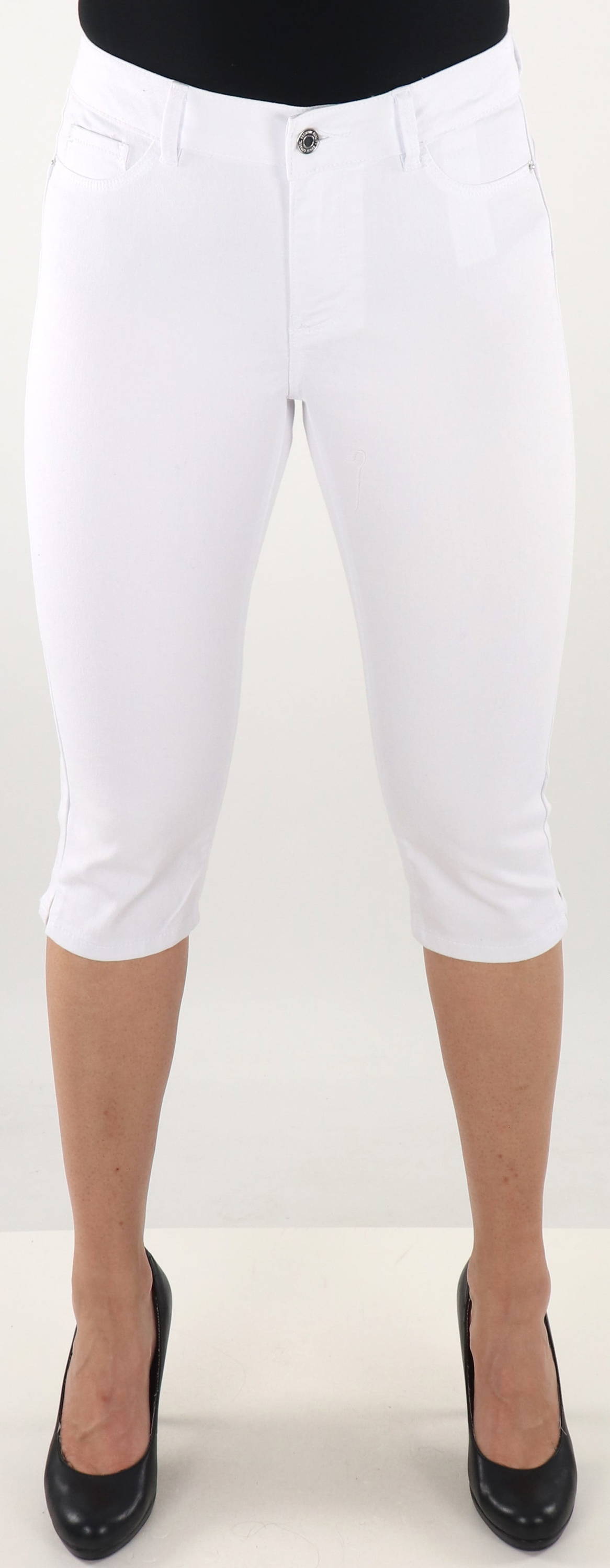 White capris with a normal waist.
