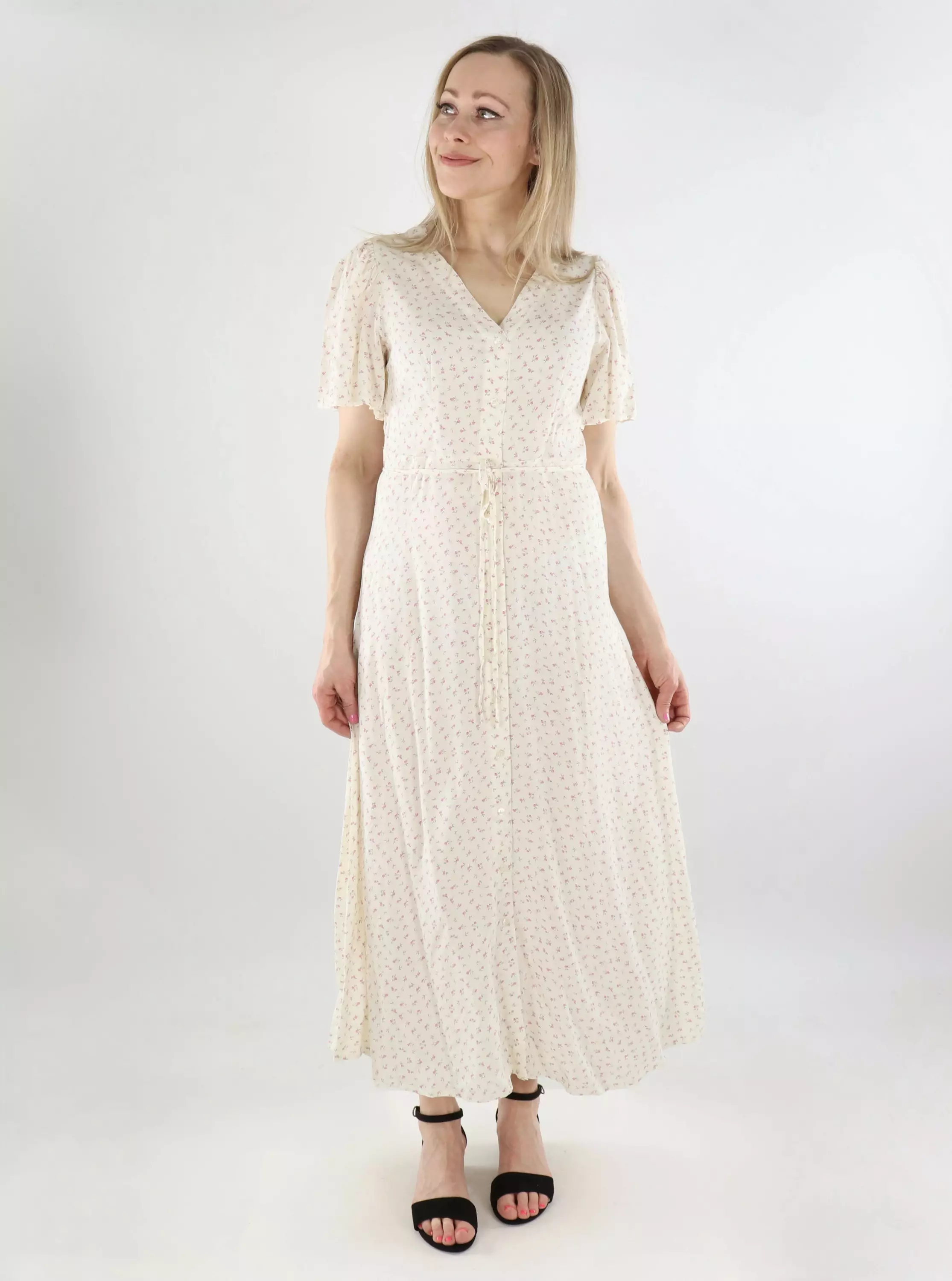 A light floral dress with buttons and a V-neck. Made of very light and breathable viscose.