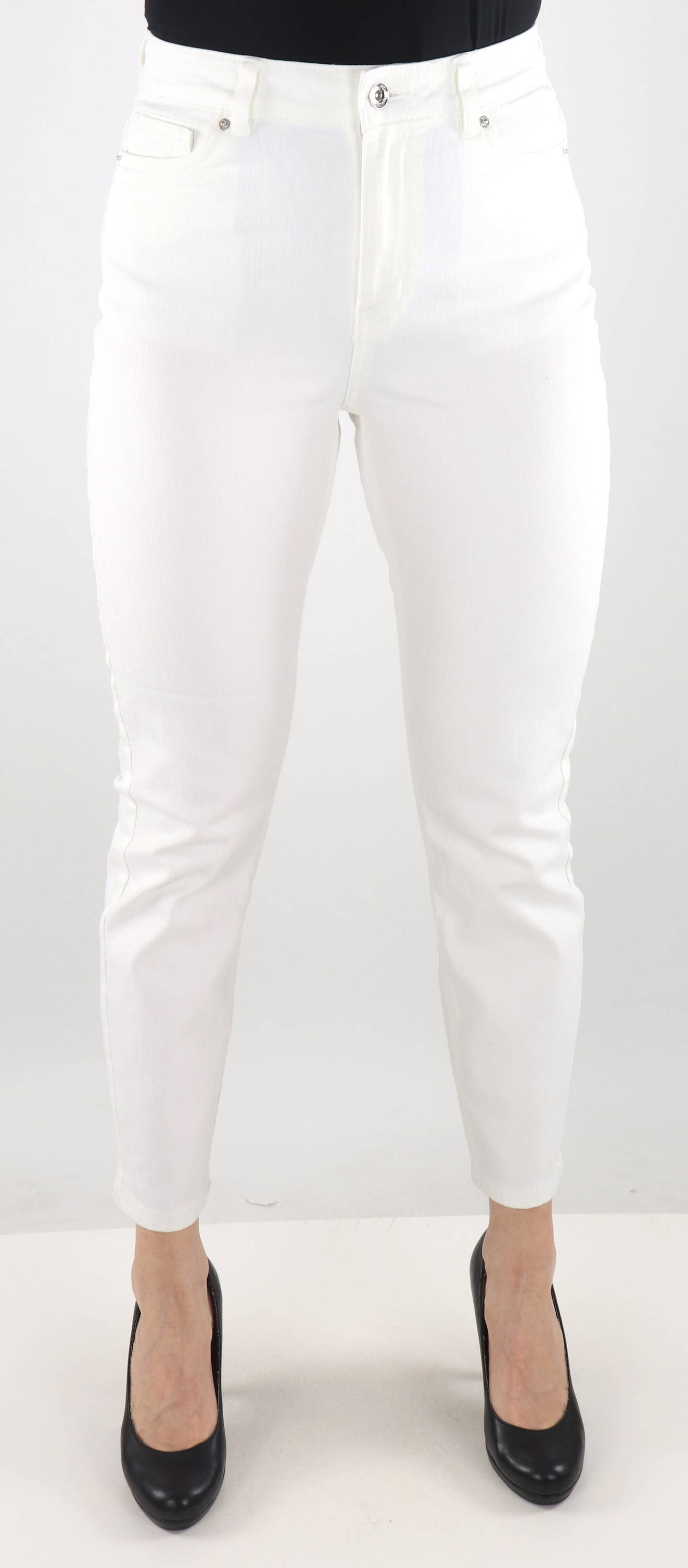 The color of the jeans is white, so you can build several outfits - in our online store. There are several options, for example you can choose a black blazer and combine it with red heels. You can find everything you need in the Stilettoshop.eu online store