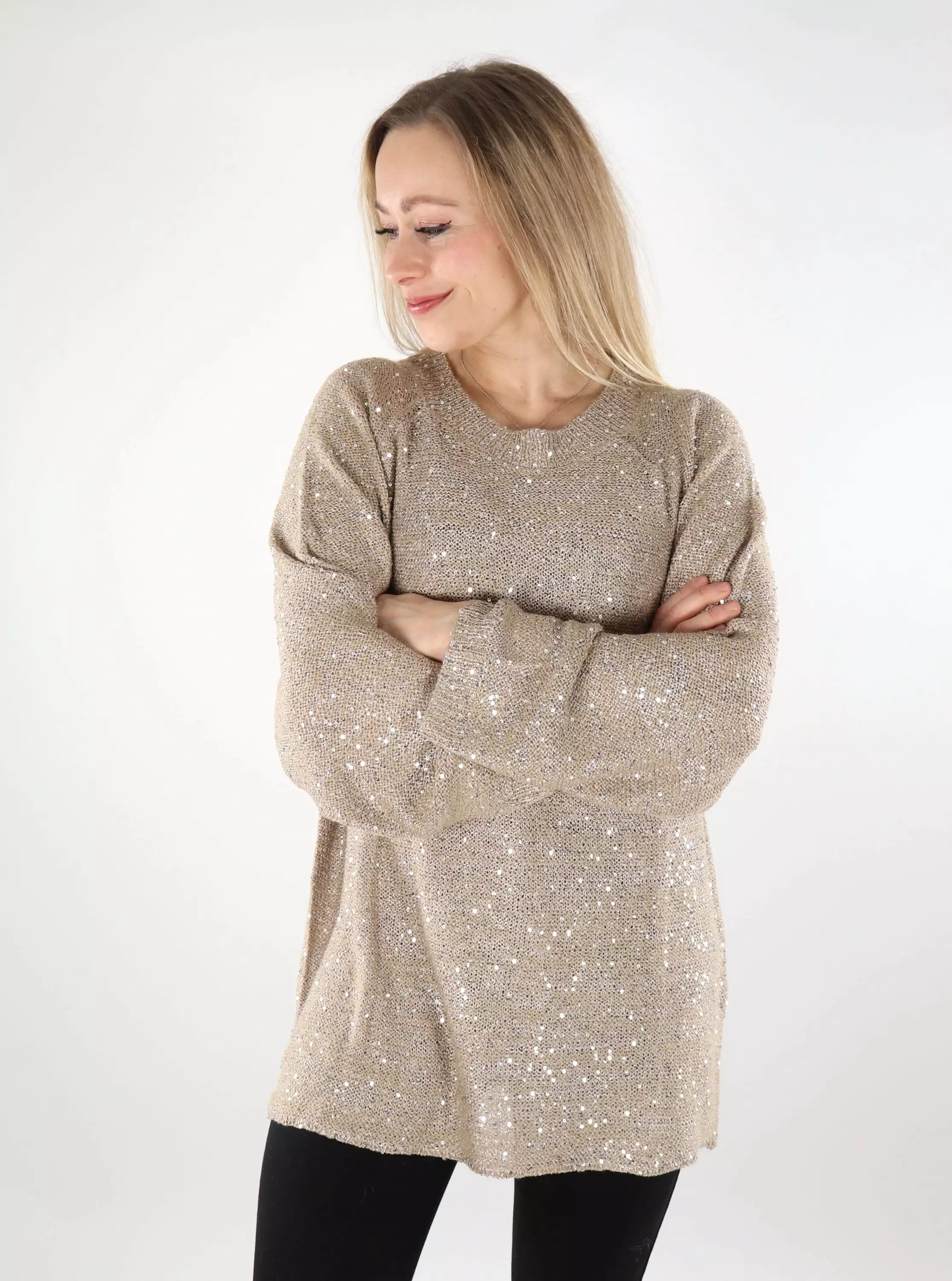 A gorgeous long sweater with sparkling sequins. The sweater has stylish relaxed sleeves.