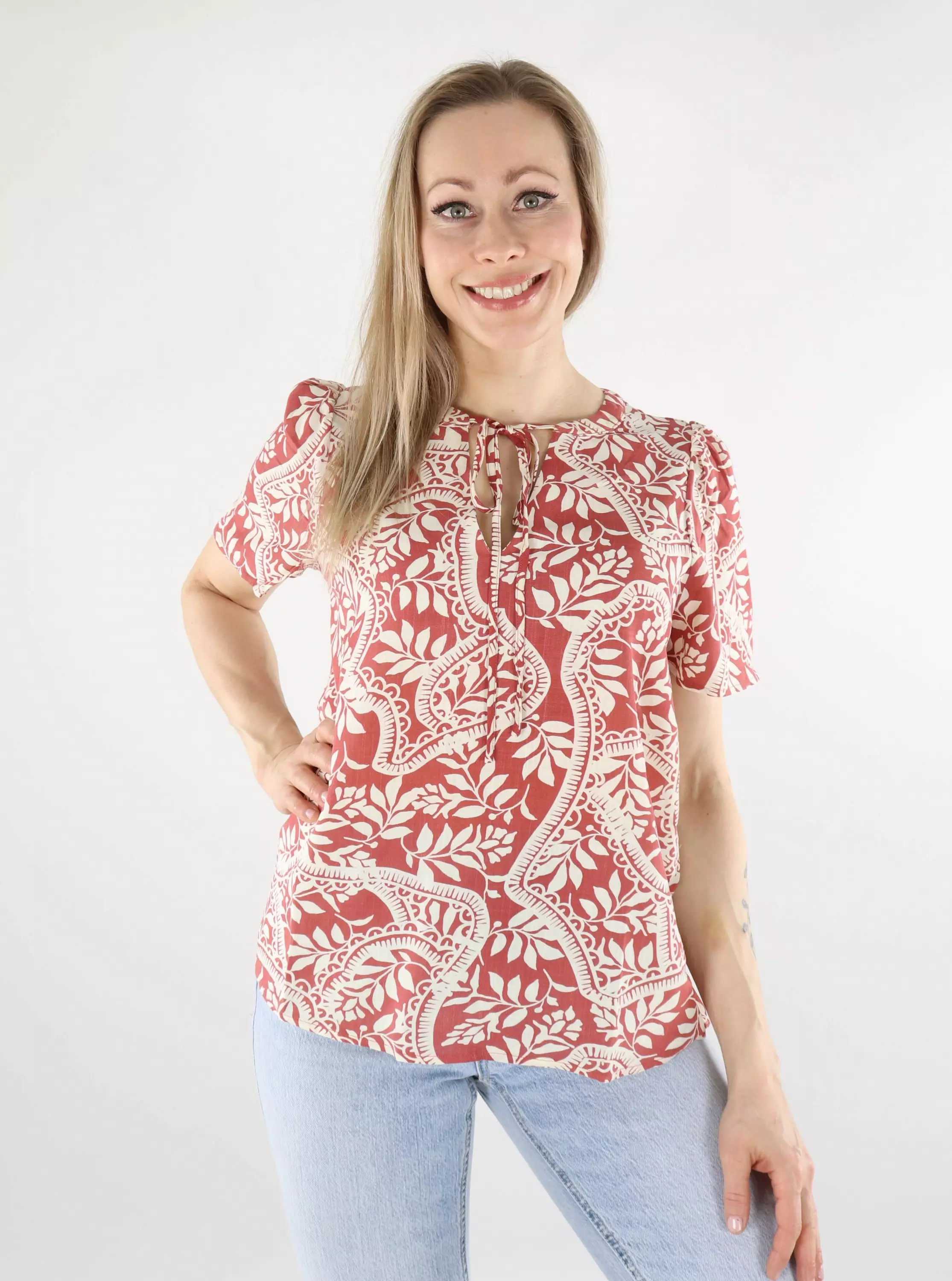 This Vero Moda patterned t-shirt is made of ecological viscose, which feels soft and breathable on the skin. The V-neck with drawstrings gives the shirt a stylish and feminine detail.