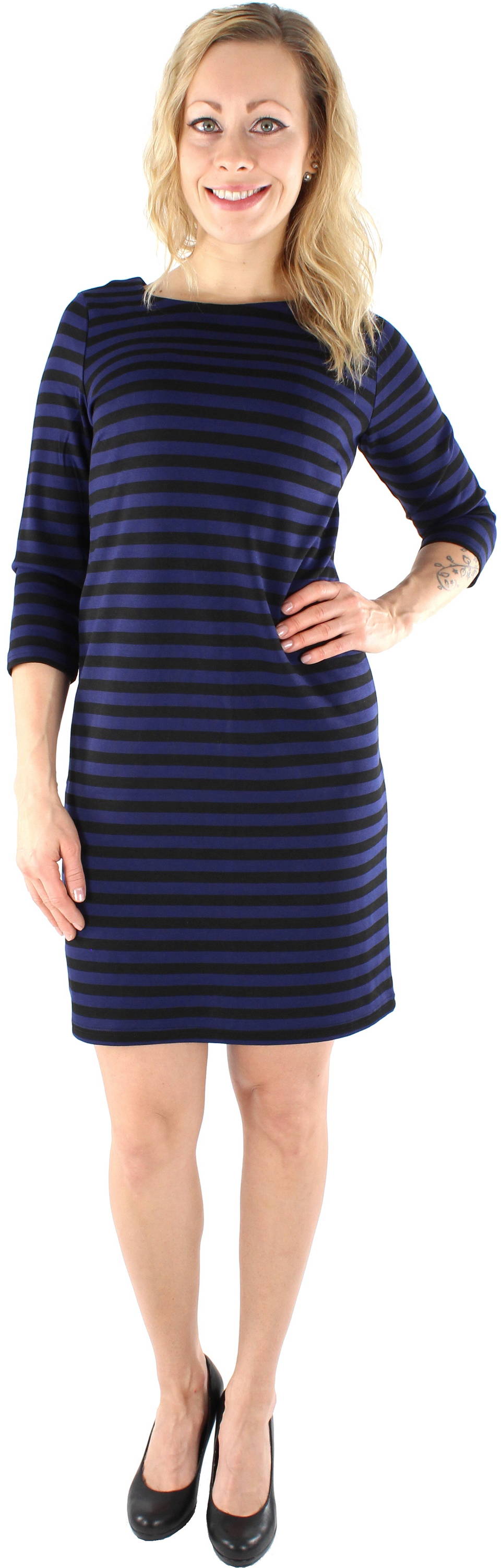 Classic 3/4 sleeved jersey stripe dress in a stylish combination of black and plum colored stripes.