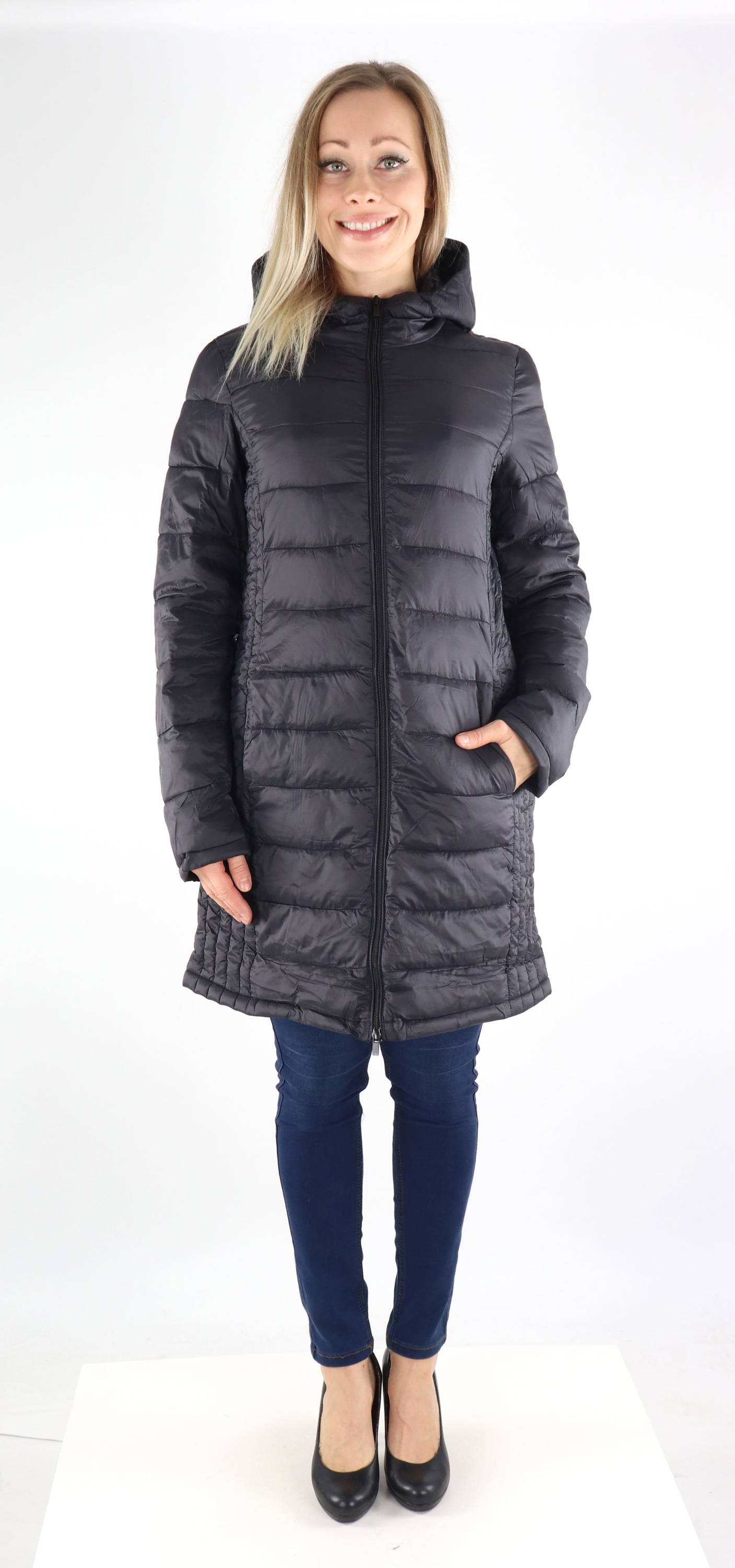 Cottonwool filled half length hooded quilted coat with two pockets.