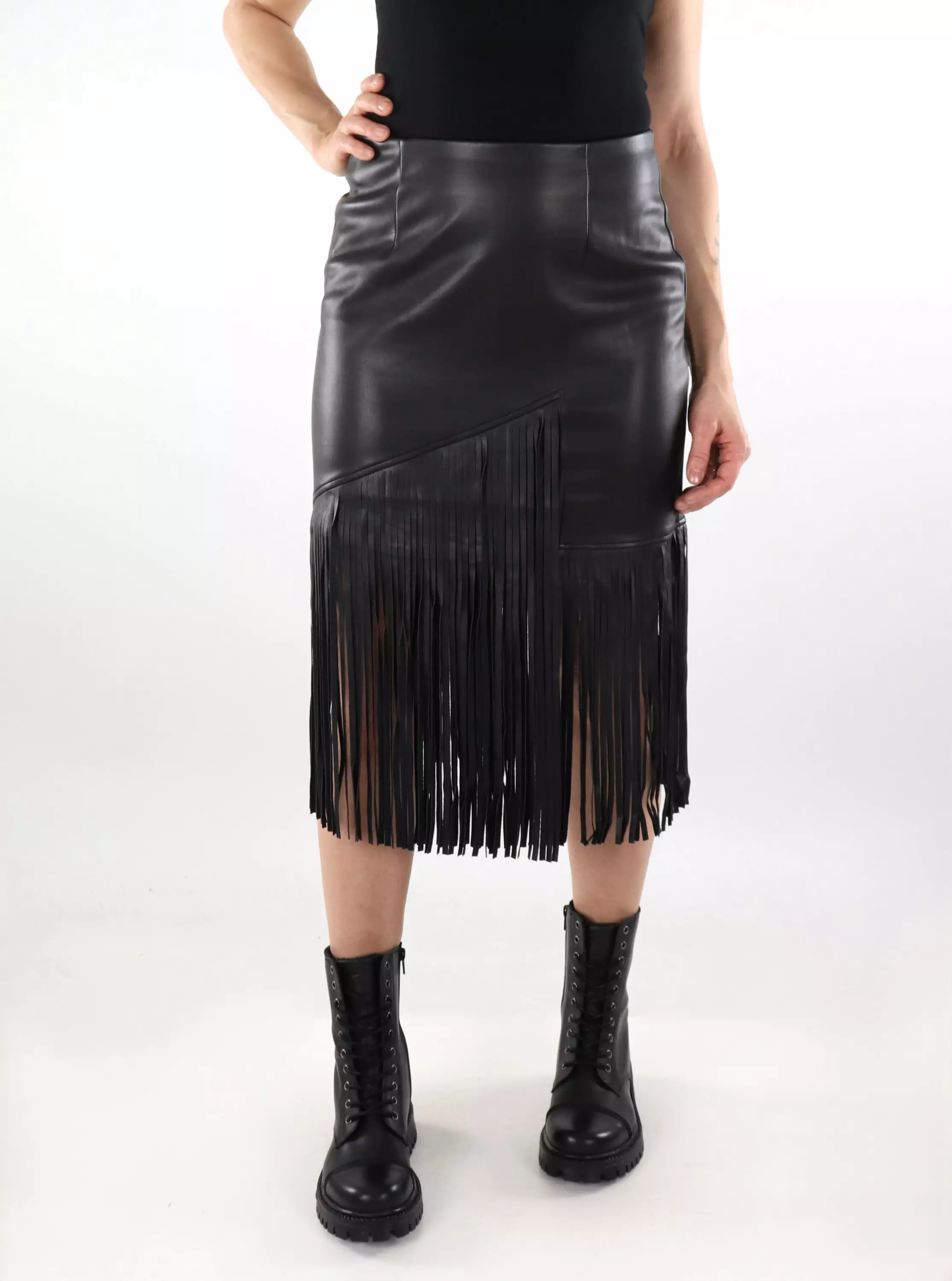 Trendy and stretchy faux leather skirt with visible fringes at the bottom!