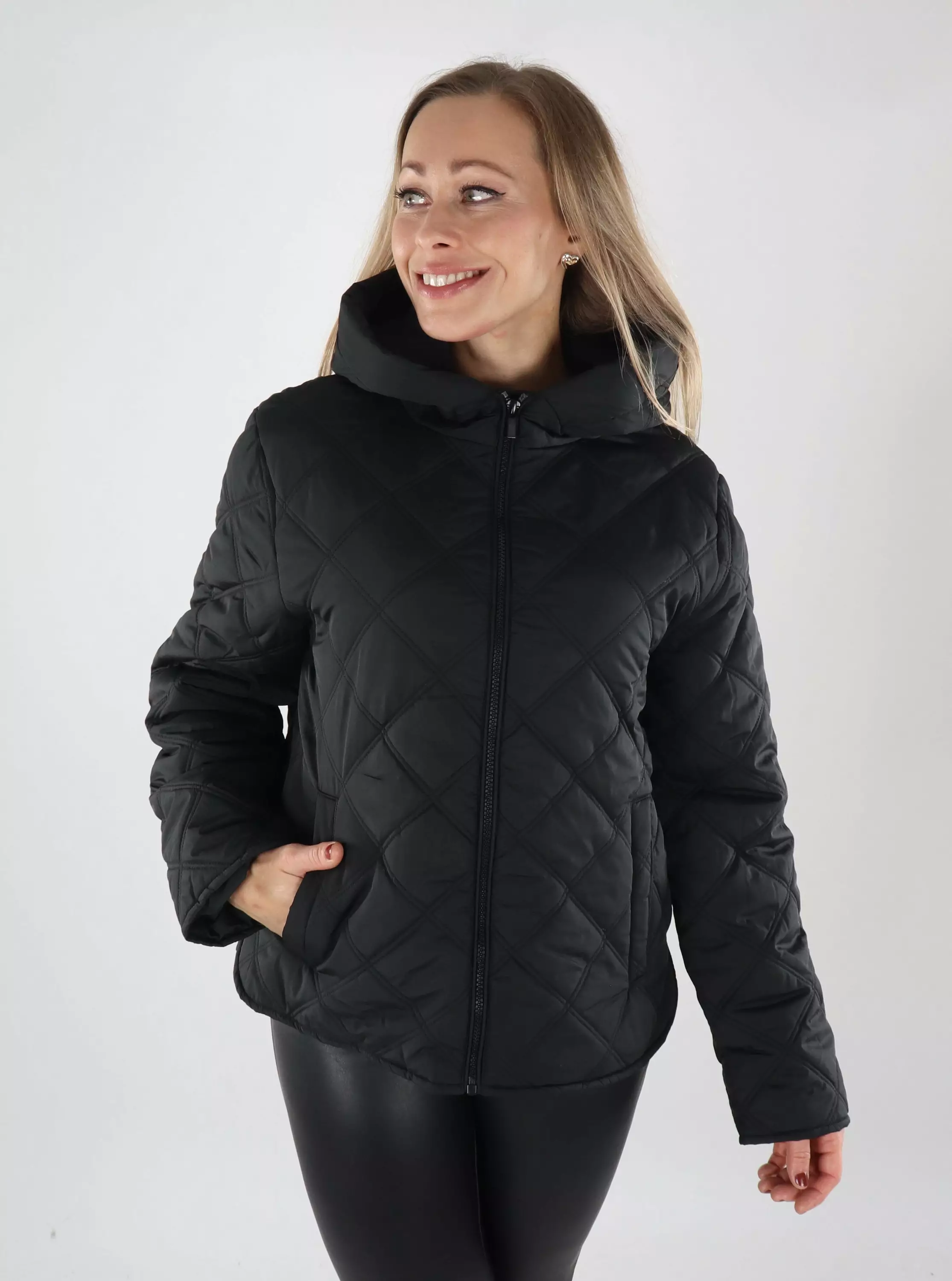 Vila's beautiful quilted lightweight padded jacket with a fixed hood and rounded hem.