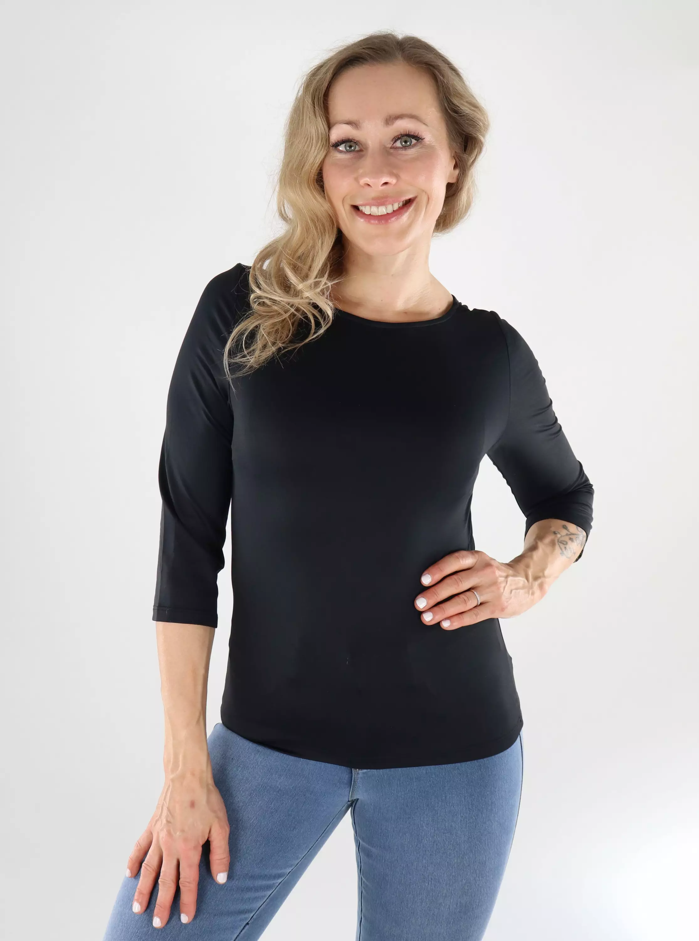 A classic black shirt with a boatneck and 2/4-length sleeves. An absolute wardrobe staple that can be combined with any bottom!