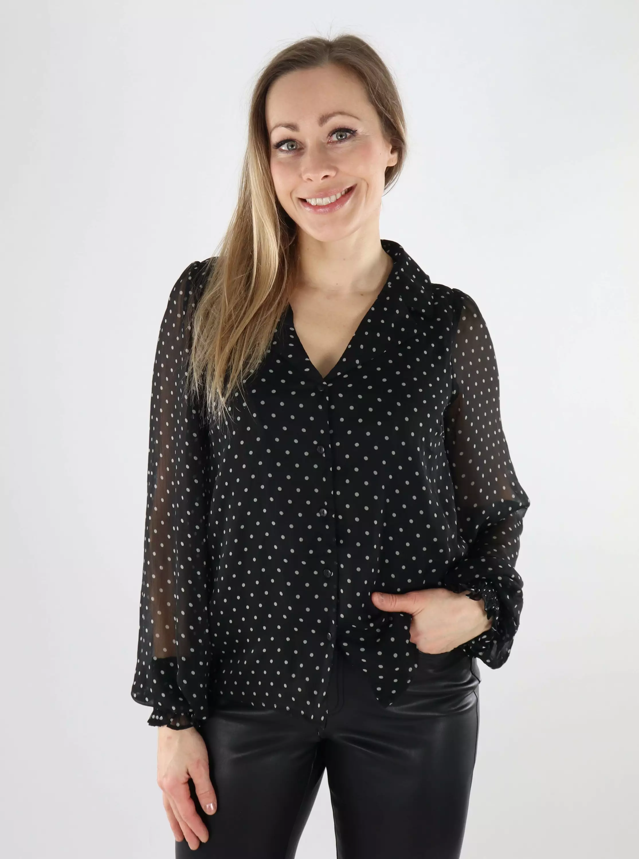 Vila's polka dot shirt with a feminine V-neck. The lightweight material and classic cut make the shirt a stylish and versatile choice for everyday wear or a more dressy look.