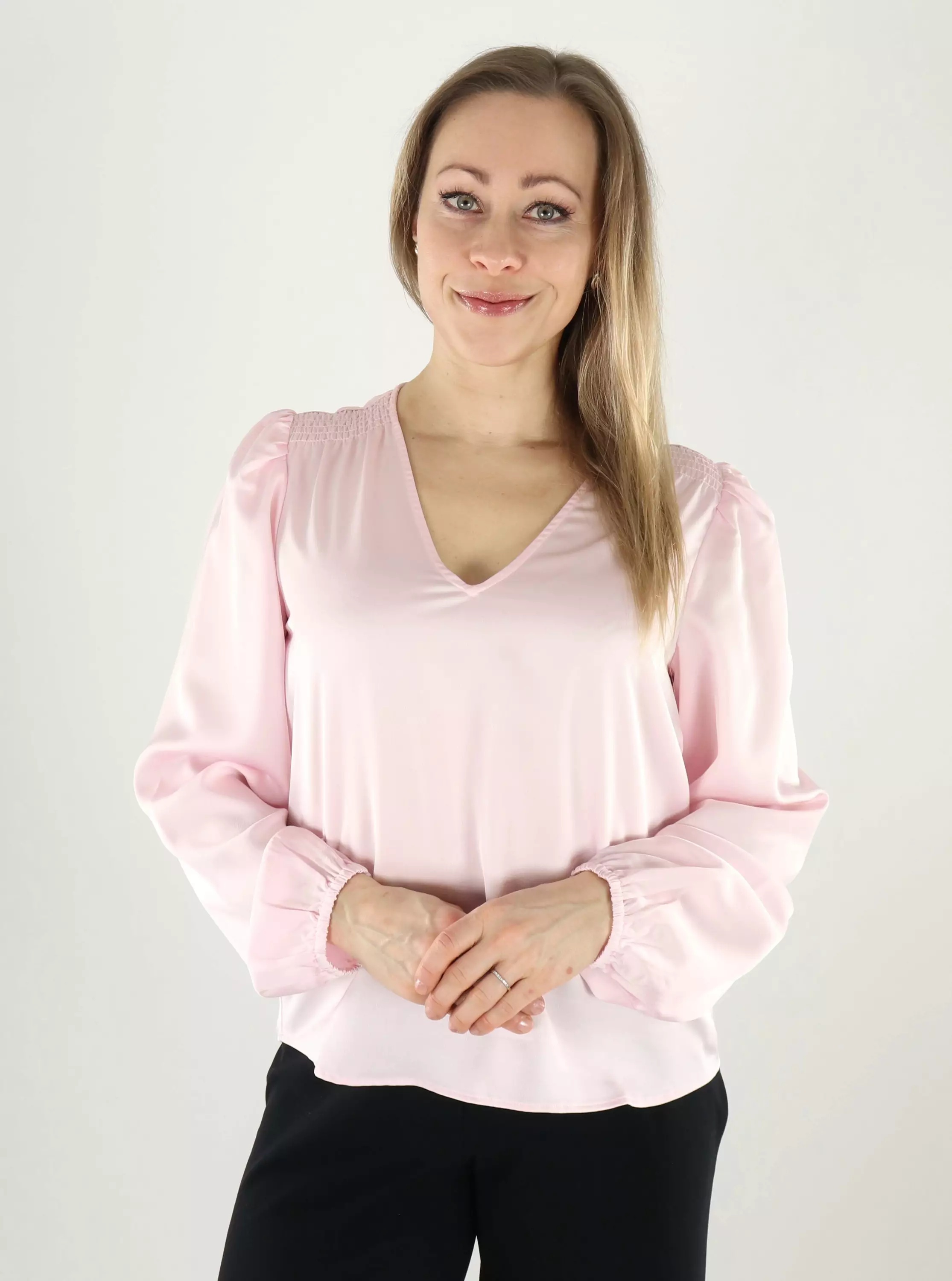 A versatile satin shirt is a sure choice when you want a well-groomed but relaxed look. The V-neckline beautifully highlights the cleavage, and the smock details on the shoulders give the outfit a striking look.