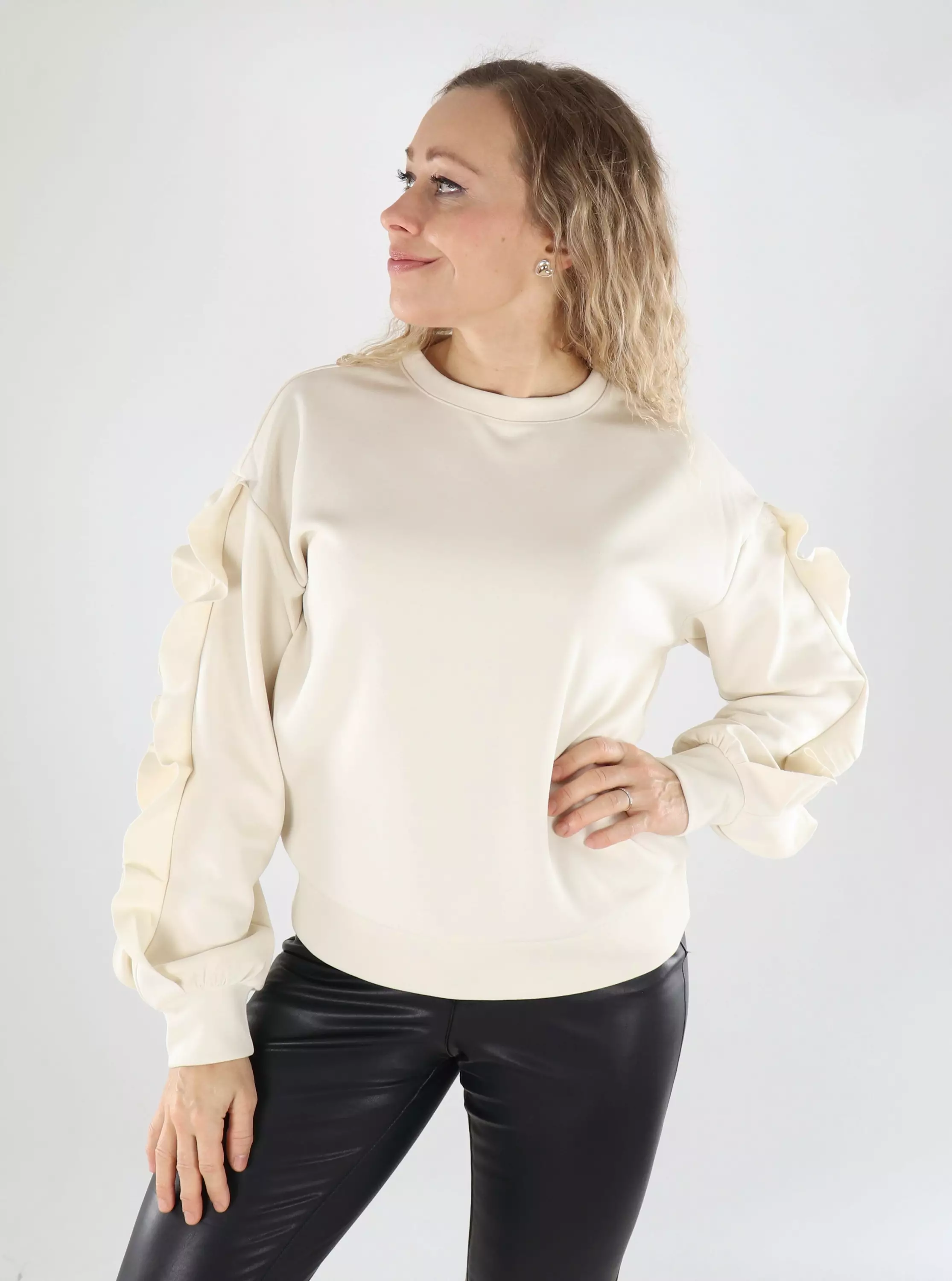 Bring a touch of feminine flair to your everyday wear with this soft sweatshirt! The striking frill details on the cuffs add a stylish twist to the classic design. This comfortable and versatile shirt is perfect for both casual office style and leisure.