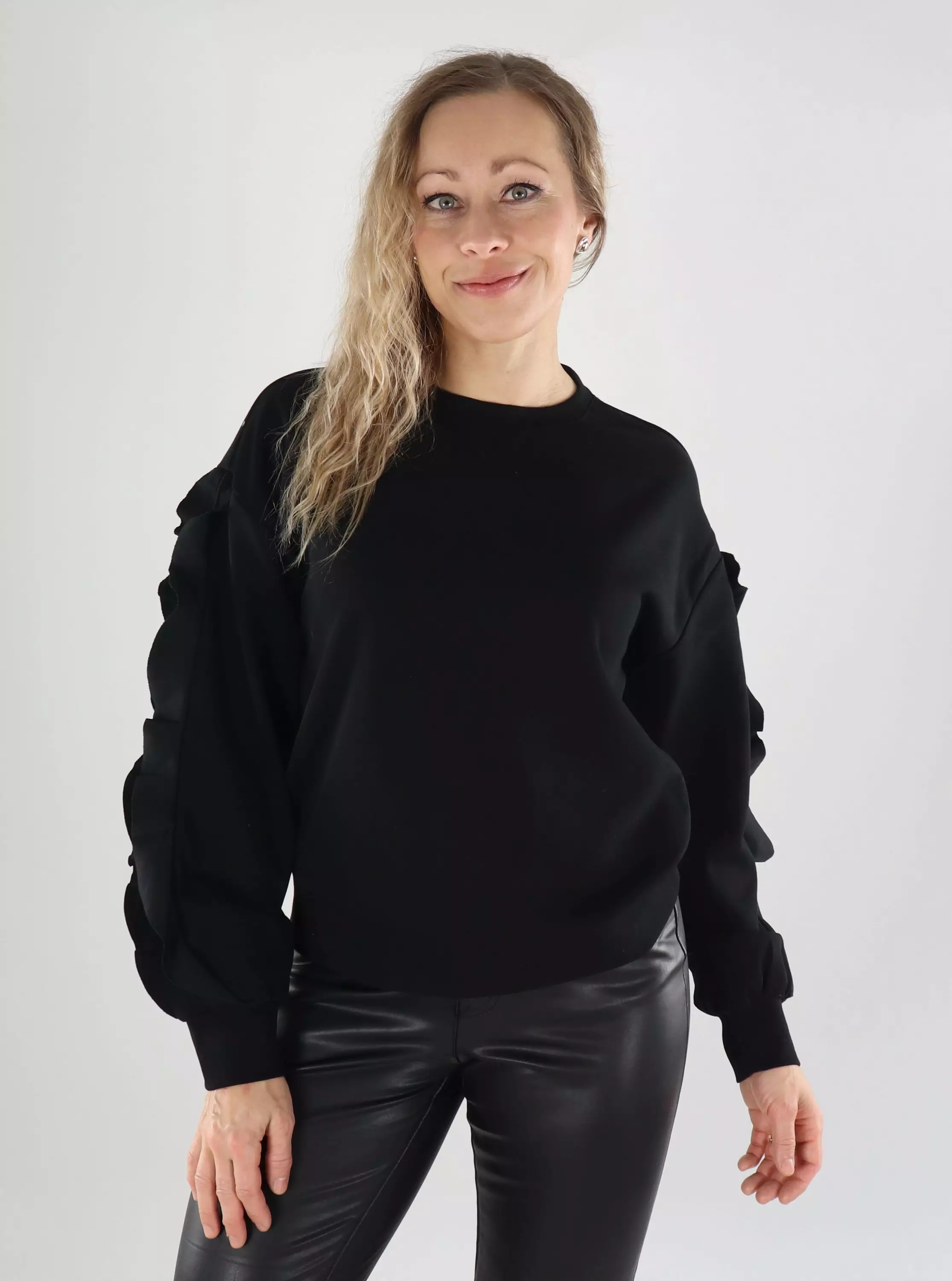 Bring a touch of feminine flair to your everyday wear with this soft sweatshirt! The striking frill details on the cuffs add a stylish twist to the classic design. This comfortable and versatile shirt is perfect for both casual office style and leisure.